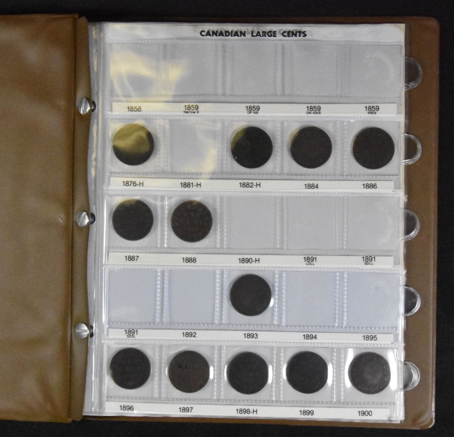 A Canadian collection of 32 Large cent coins in collector album. A great collection and assortment of coins, viewing recommended. Collection features a 1900, 1907-H. 32 Pcs.