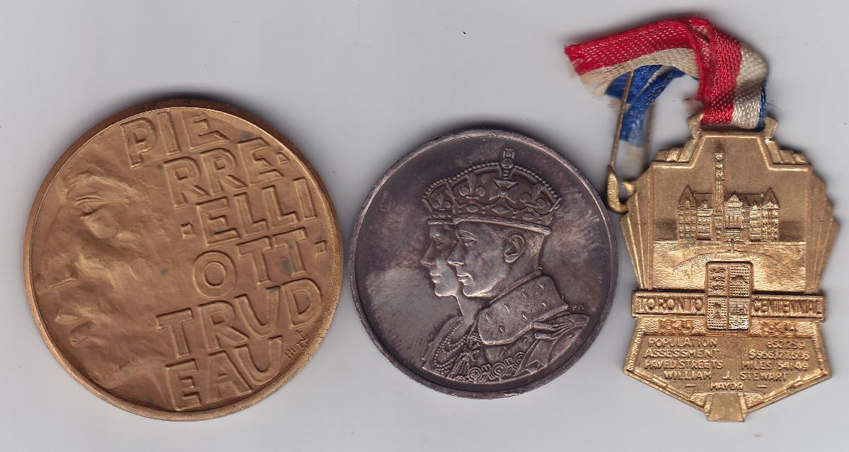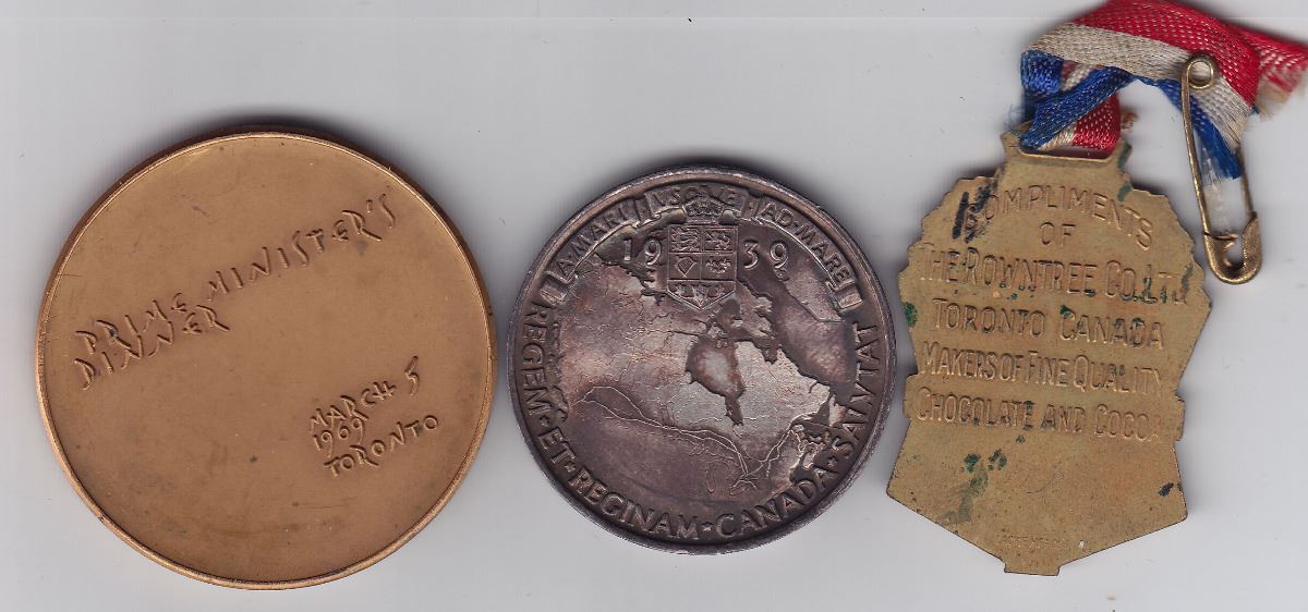 1939 Royal Visit, 33mm, silver, AU; 1834-1934 Toronto Centennial medal, ribbon attached in loop, issued by Rountree, UNC; Pierre Elliot Trudeau, Prime Minister's Dinner, Toronto, 1969, Dora De Pedery Hunt, 38mm, UNC. 3 Pcs.