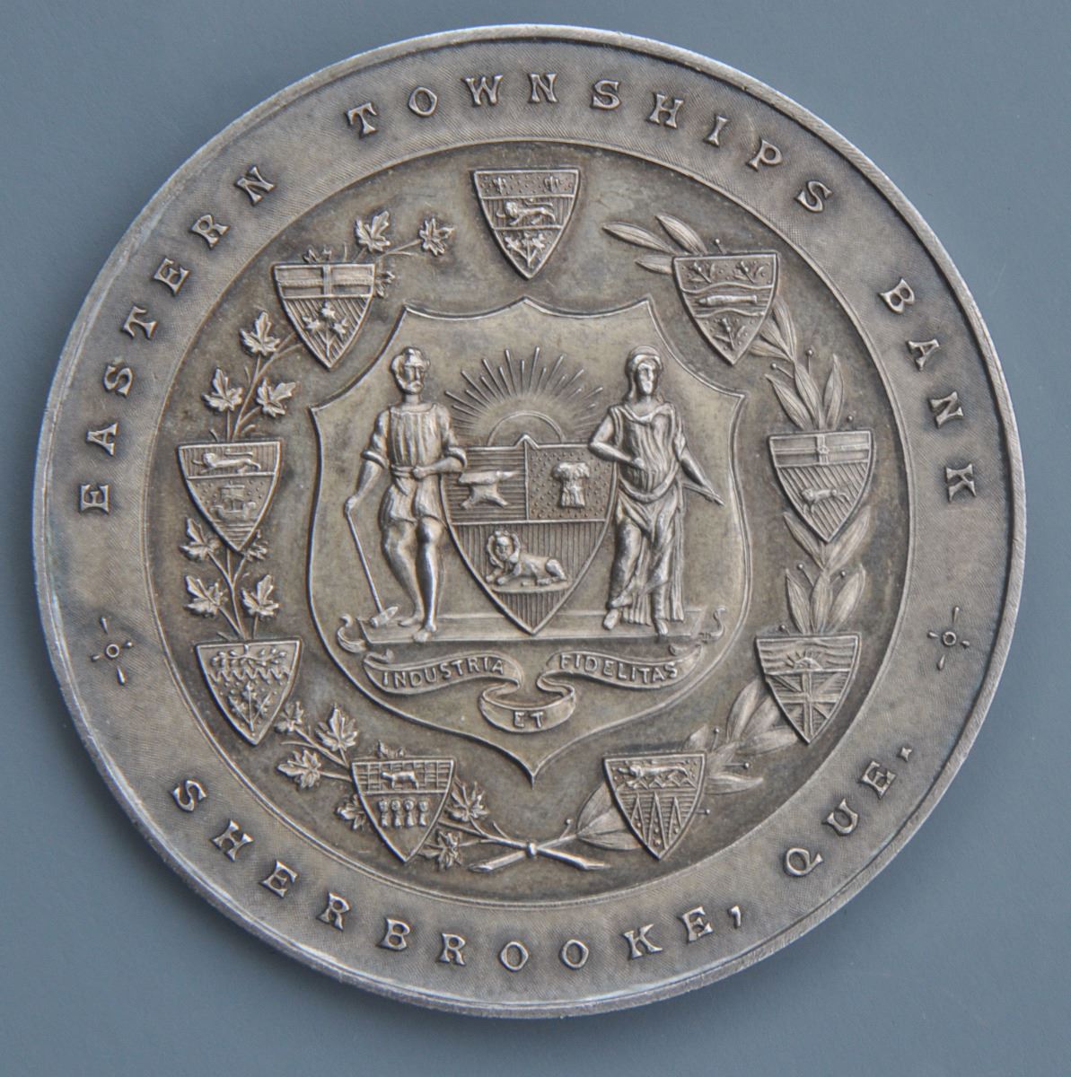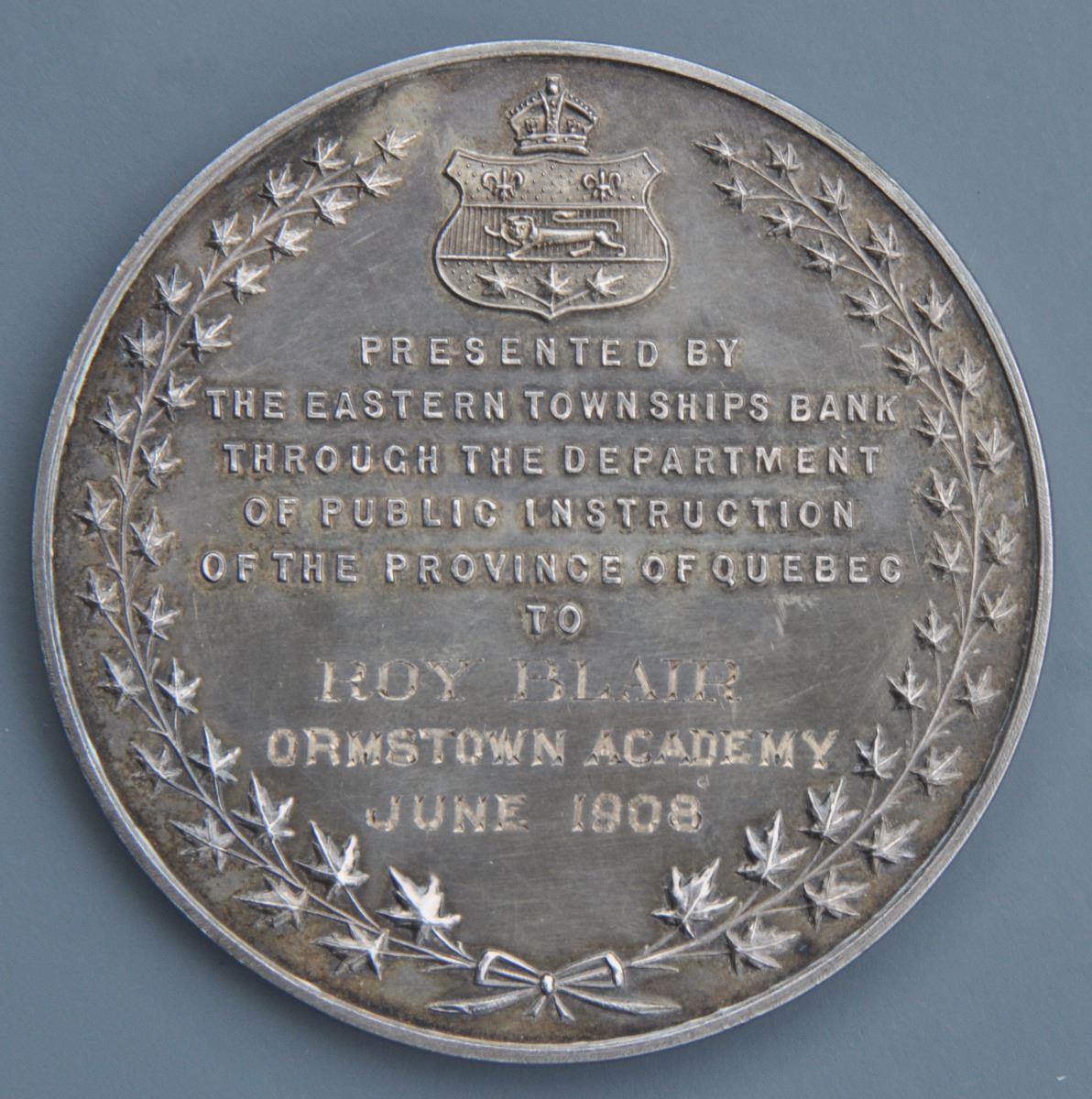 57mm, Silver. Eastern Townships Bank, Sherbrooke, Quebec, awarded to" Roy Blair/Ormstown Academy/June 1908, 81.9 gms, UNC.