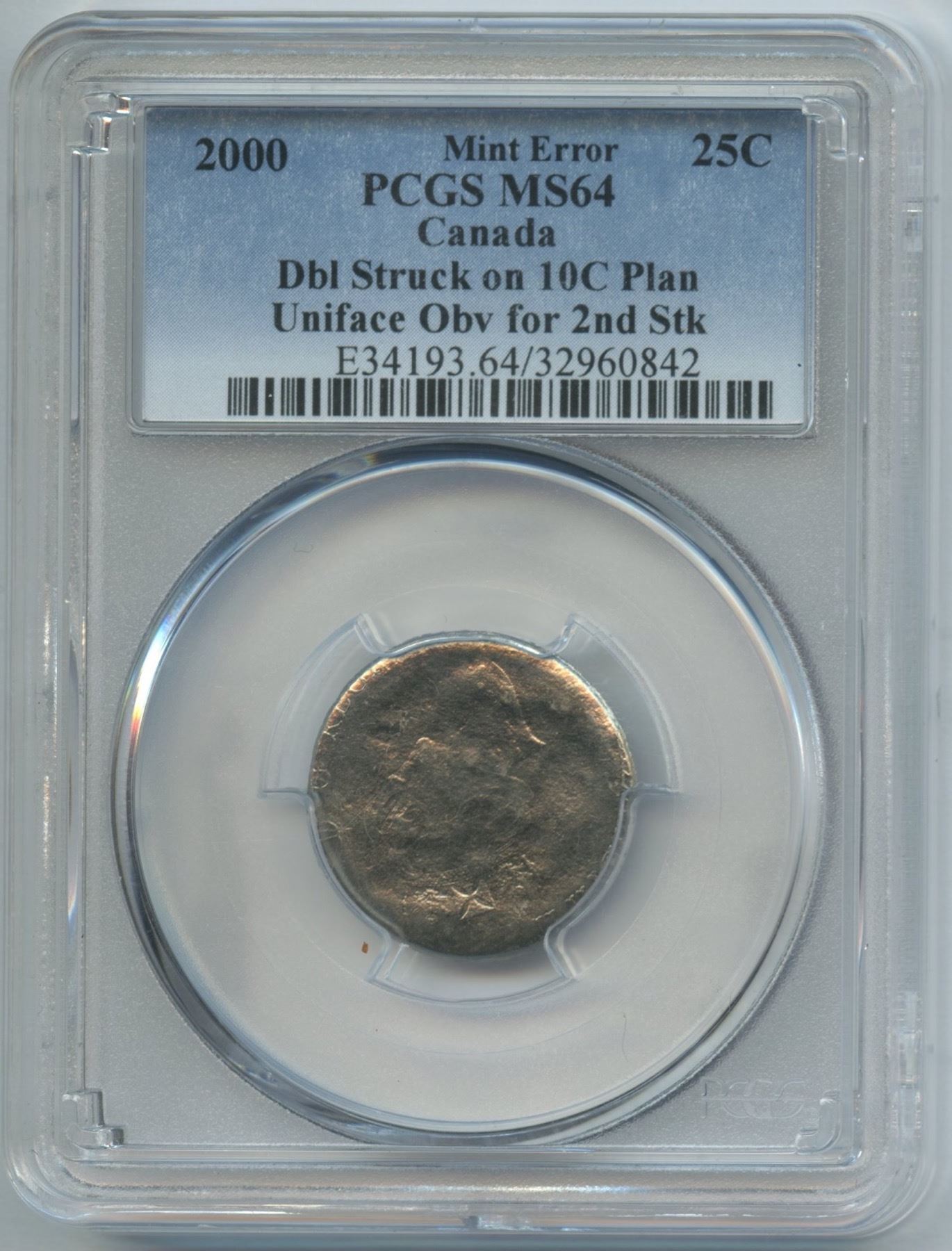 2000 MS64, a very rare error with double struck on a ten cent planchet, uniface Obv. for second strike.