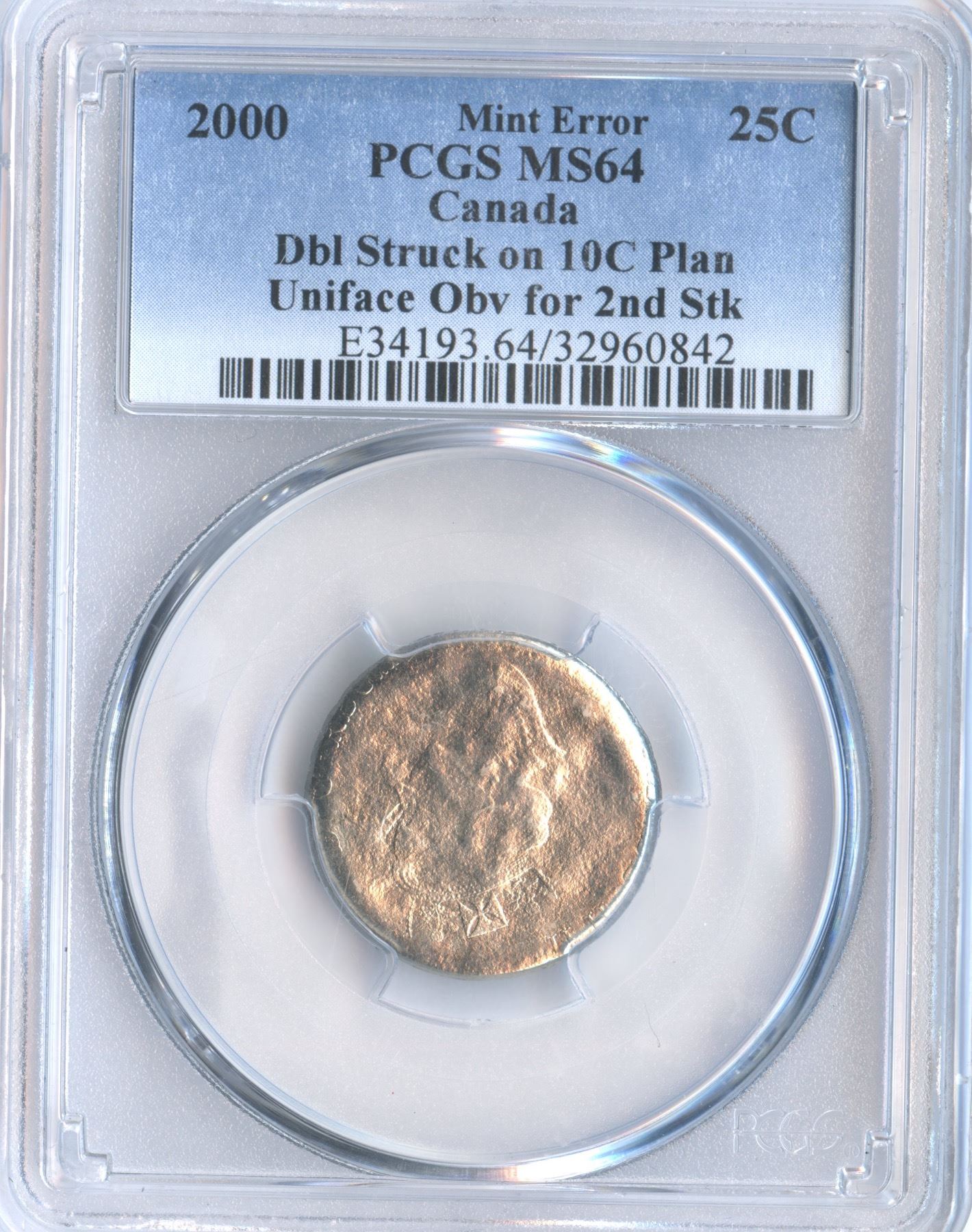 PCGS Certified MS64, a very rare error with double struck on a ten cent planchet, uniface Obv. for second strike.