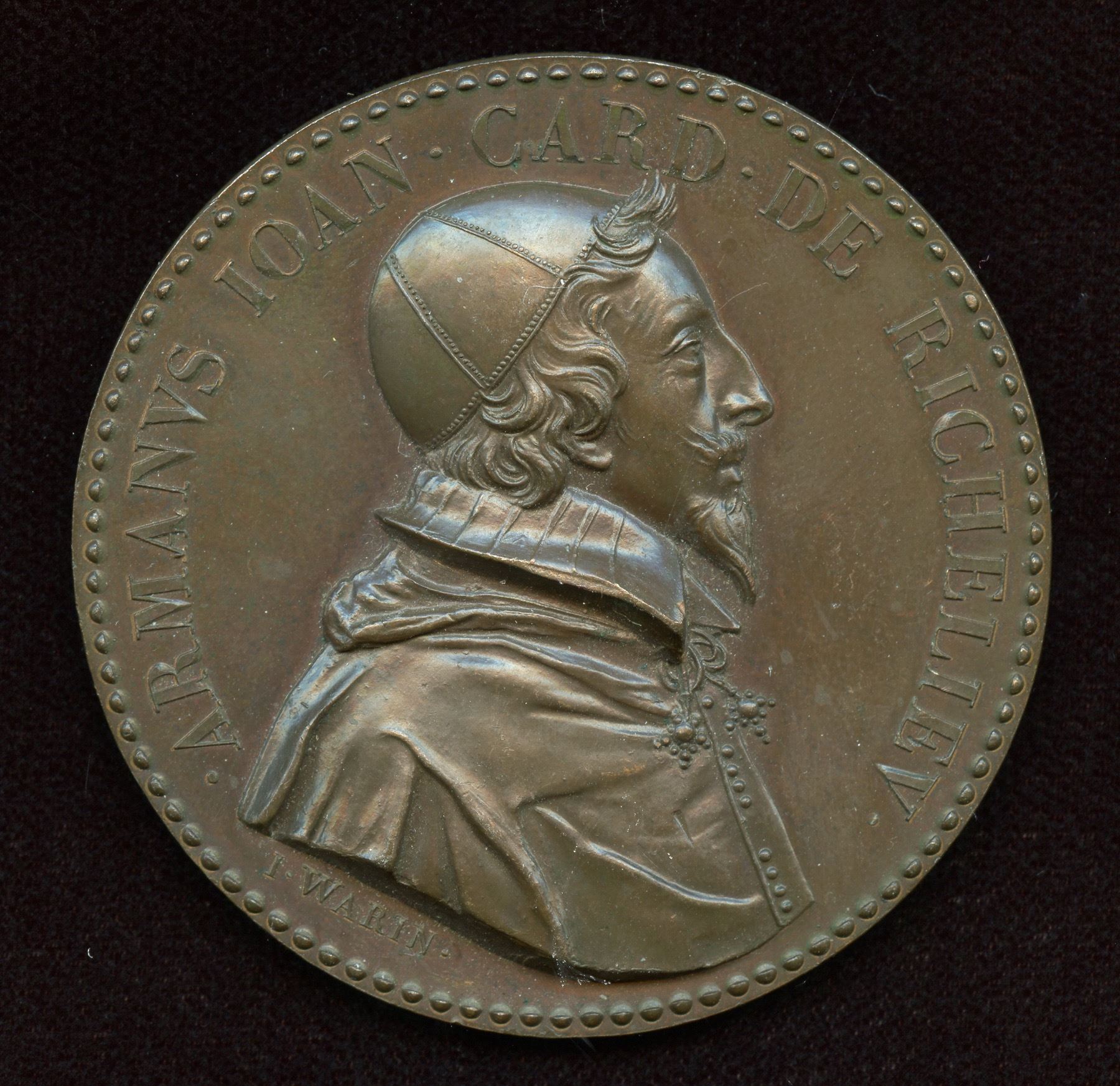 Bronze 51m by Jean Warin Bust of Richelieu right. ARMANVS IOAN. CARD. DE RICHELIEV. J.WARIN below. Reverse Angel beside stars around Earth MENS SIDERA VOLVIT. 1631. Leroux 302 Plain edge. Likely late 18th early 19th century restrike. Lovely chocolate surfaces FDC.