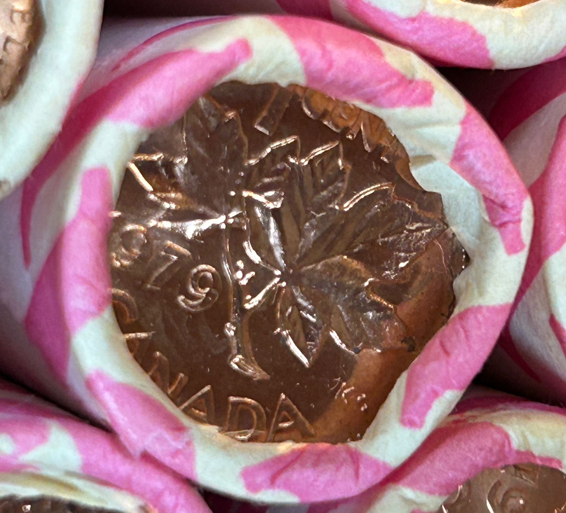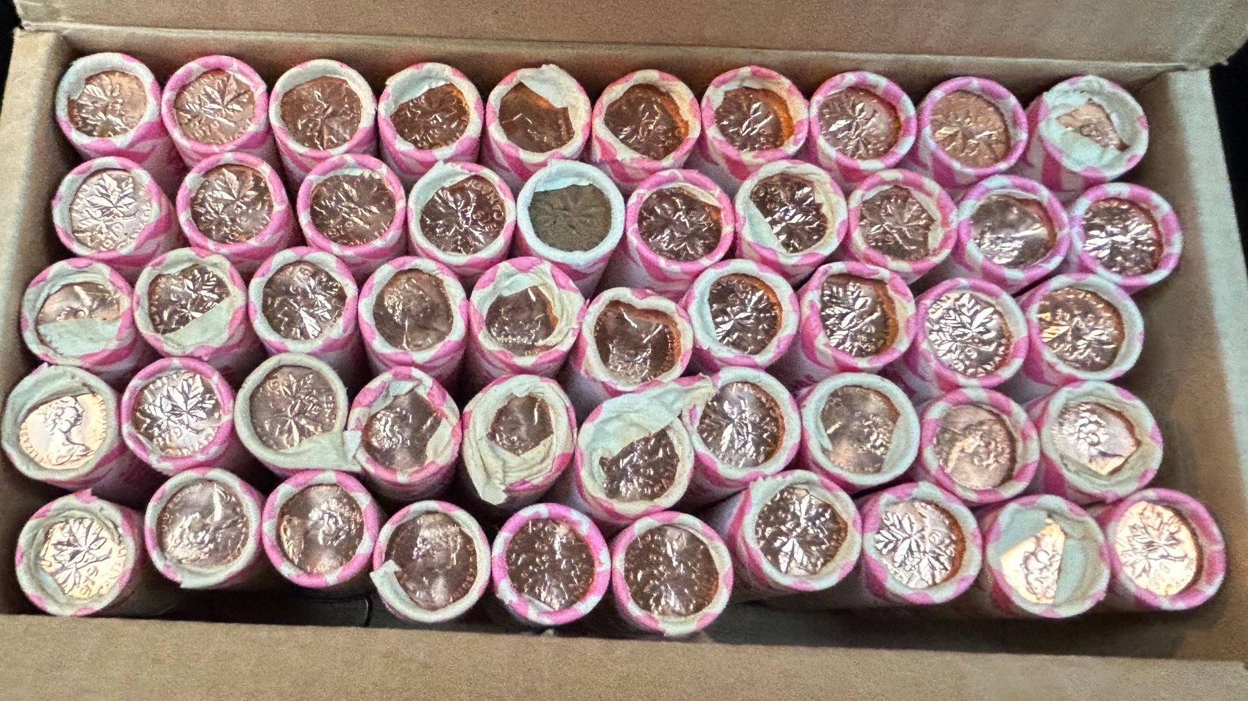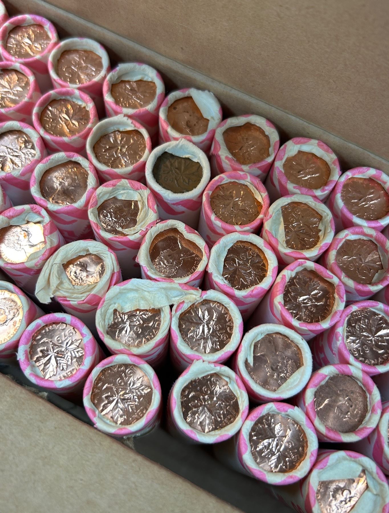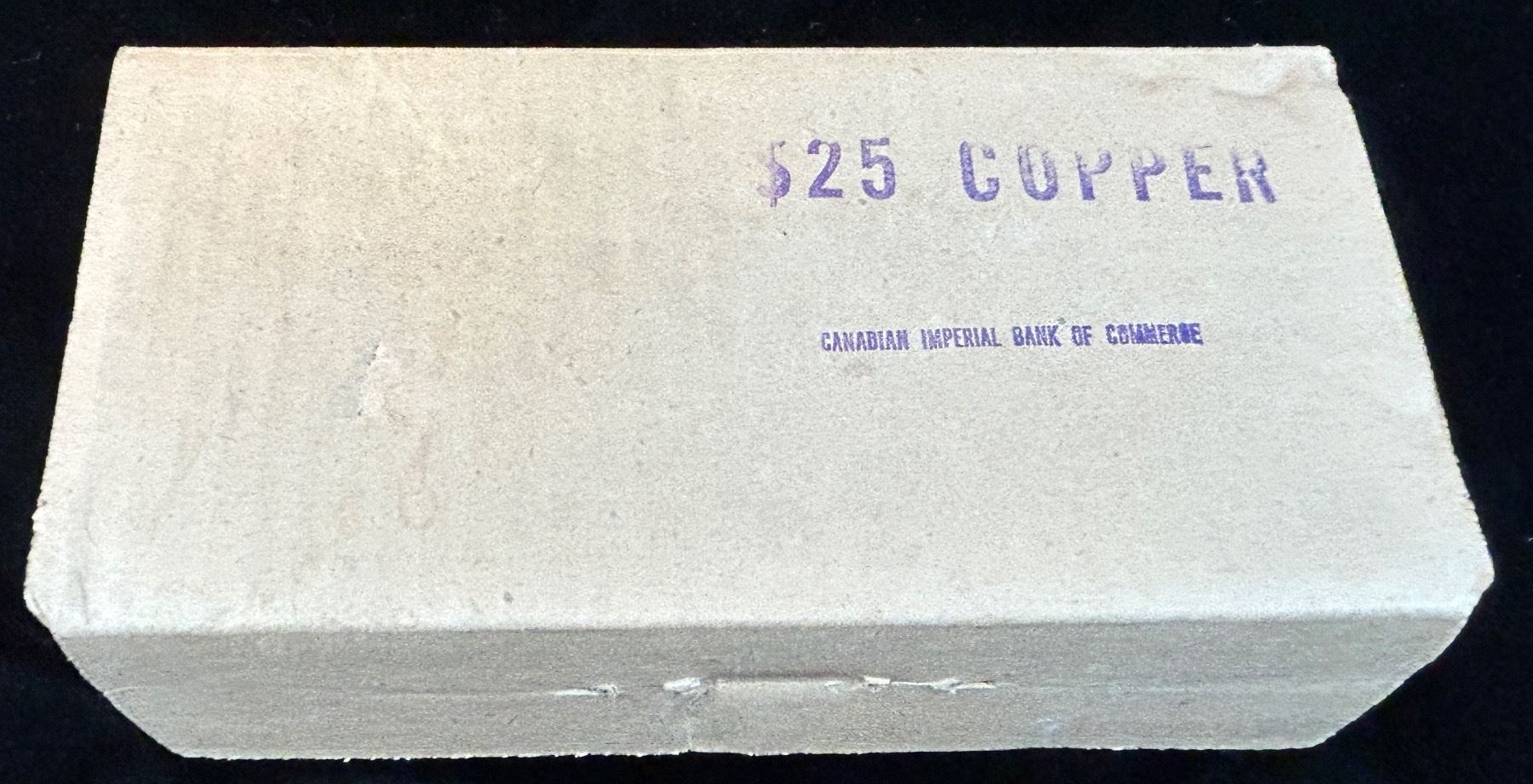 Box of Canadian 1 cent rolls from 1979. Original sealed box from the Canadian Imperial Bank of Commerce. Box staple was removed to see the inside contents. 50 rolls in total. Coins appear to have been rolled by the bank institution.