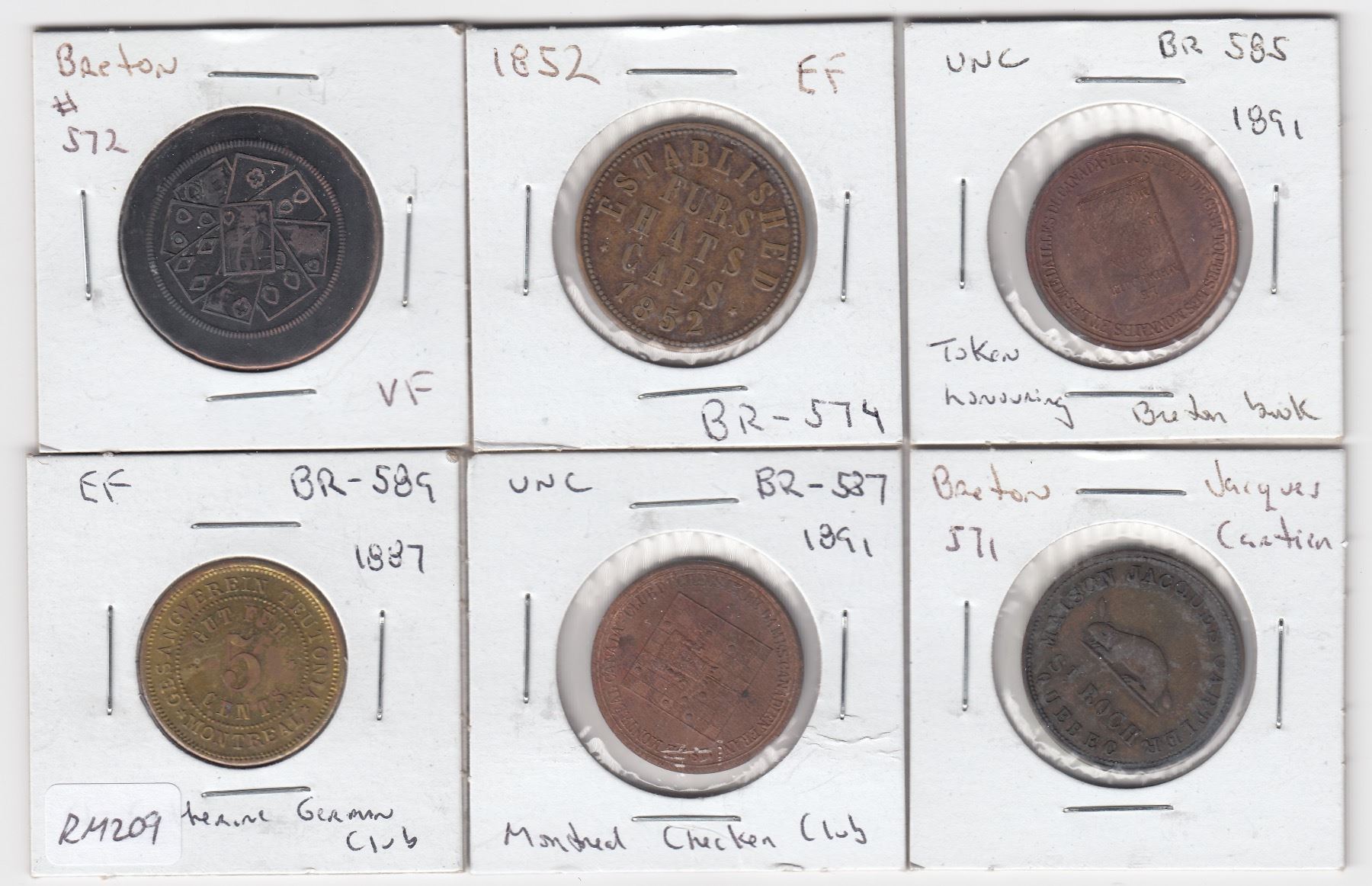 BR 537, Montreal Checkers Club, UNC; BR 571, St Roche, VF;BR 572, Checker, VF; BR 574, gnaedinger, Montreal, EF; BR 585, French issue, UNC; BR 589, Gnaedinger, Montreal, UNC Lot of 6 pcs.