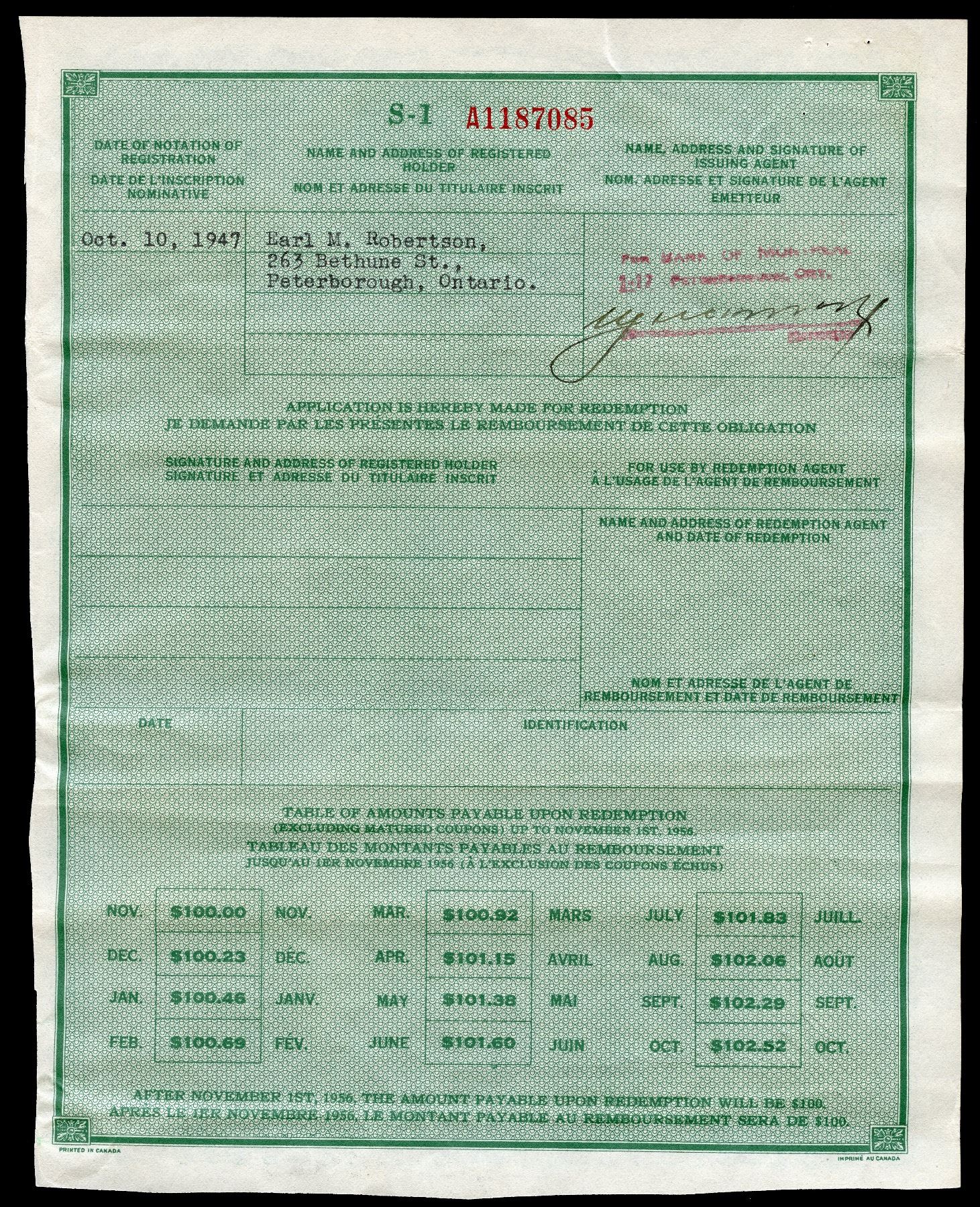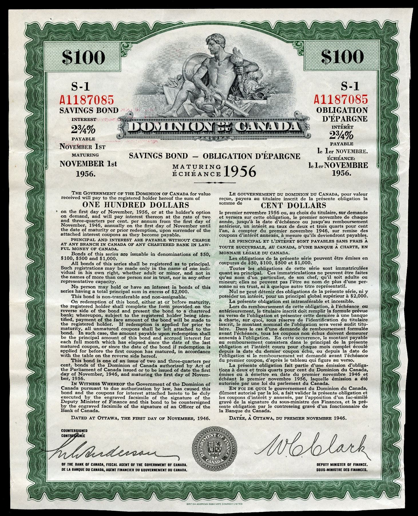 Dominion of Canada $100.00 dated 1946 , UNC. It has a interest rate of 2 1/2 %. This is the first issue of the Canada Savings Bond.These are VERY RARE and very collectible.