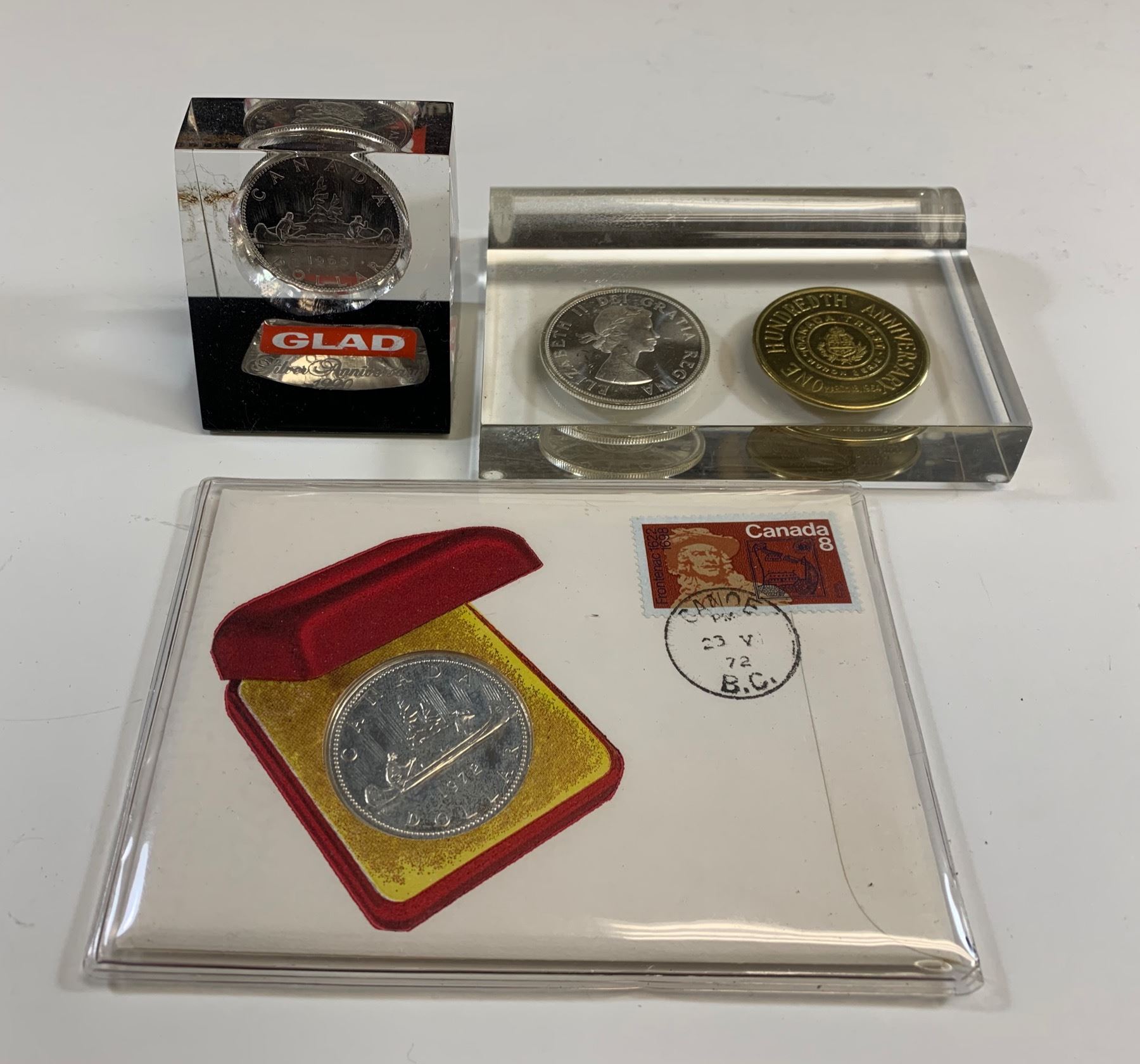 Includes: 1964 Canada Trust Huron & Erie in acrylic. 1965 Glad's Silver Anniversary. 1972 First Day Cover with coin. 3 Pcs.