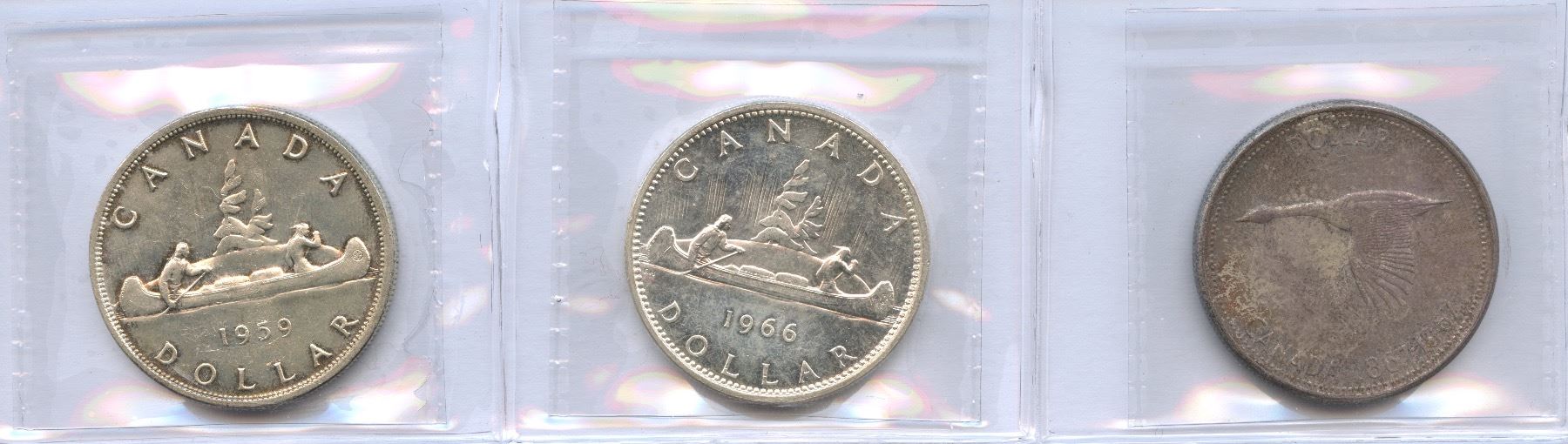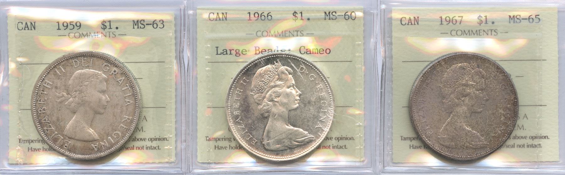 Includes: 1959 MS-63. 1966 MS-60. Large Beads; Cameo. 1967 MS-65, Toned. 3 pcs.
