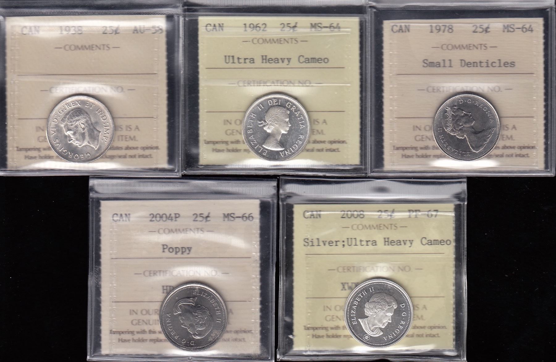 Dates include: 1938 AU-58, 1962 Ultra Heavy Cameo MS-64, 1978 Small Denticles MS-64, 2004P Poppy MS-66, 2008 Silver Ultra Heavy Cameo PF-67.