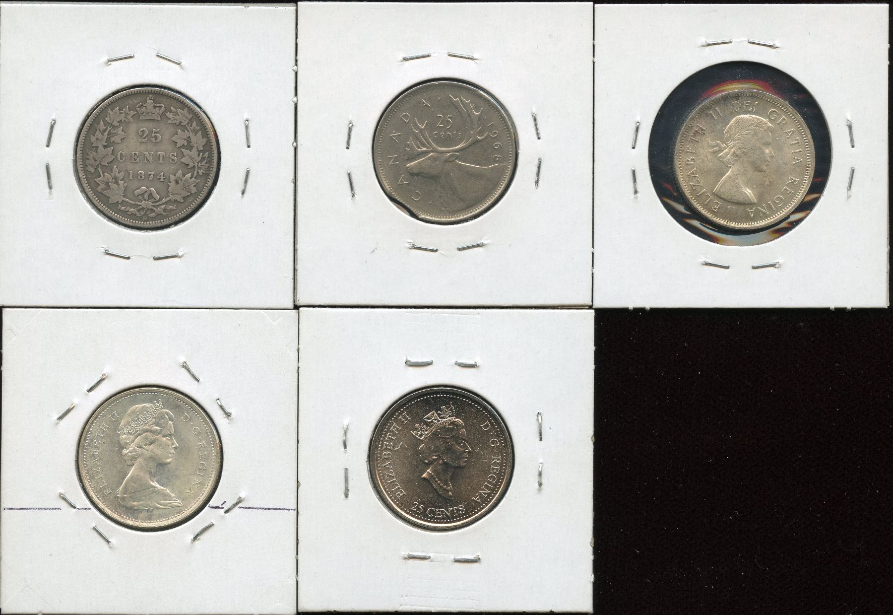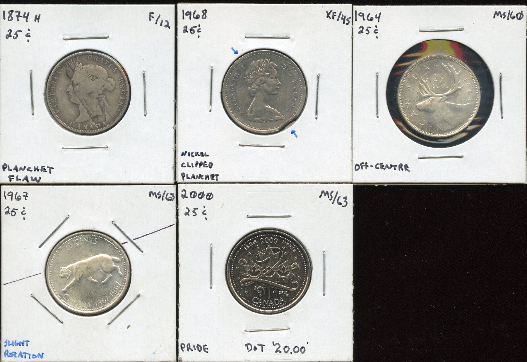 Includes: 1874H, planchet flaw, Fine. 1964 off-center, mint state. 1967 slight rotation, mint state. 1968 nickel, small clip planchet, EF. 2000 Pride, dot, mint state. 5 Pcs.