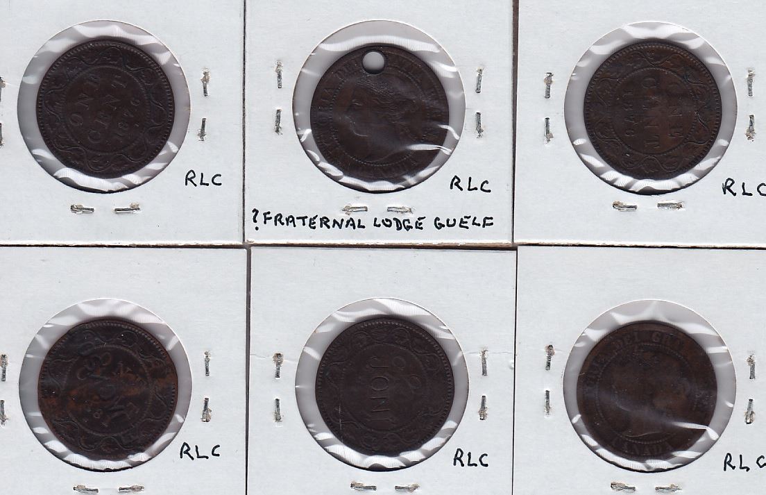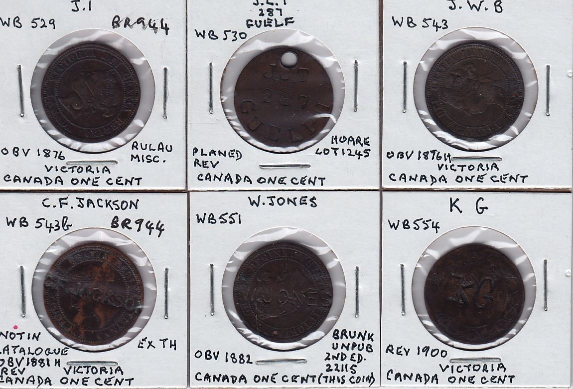 J.I on obv. of Canada Victoria cent, 1876-H (M.I. 529); J.J.T / 287 / GUELPH (curved) counterpunched on planed rev. of Canada Victoria cent (M.I. 530); J.W.B. on obv. of Canada Victoria cent, 1876 (M.I. 543); C.F. JACKSON on obv. & rev. of Canada Victoria cent, 1881-H; W. JONES on obv. & rev. of Canada Victoria cent, 1882 (M.I. 551, Brunk J-228); KG counterpunched on rev. of Canada Victoria cent, 1900 (M.I. 554). 6 Pcs.