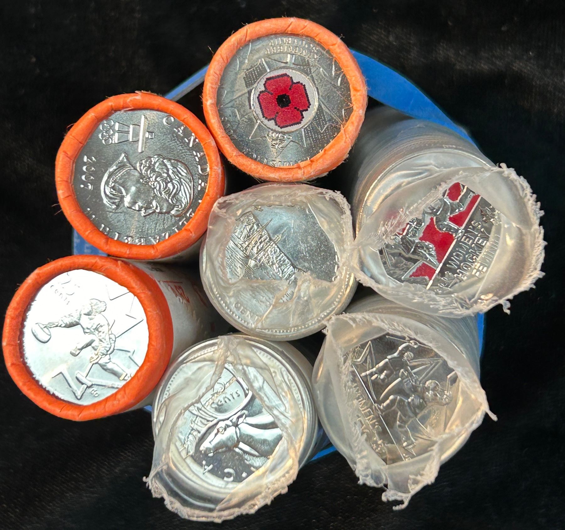 Sealed rolls included, 1x 1992, 2x 2009 Woman's Hockey, 1x 2015, 2x 2007 Curling, 1x 2008 Poppy.