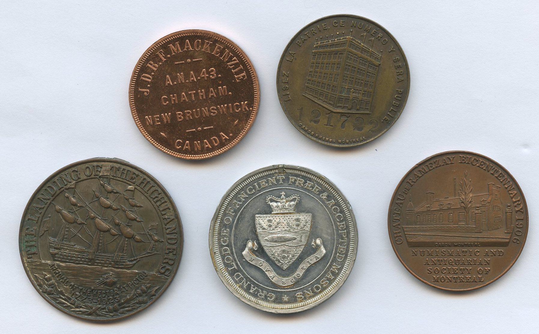 Joan of D'Arc, bronze, Montreal; 1895 Chateau de Ramezay, bronze; Masonic Charity Fair, 1898, Nova Scotia, Al; J.D.B.F. Mackenzie personal copper medal, Chathan, New Brunswick, ANA #43; Landing of the Highlanders, 1923, Pictou, Nova Scotia, bronze (SCARCE). (5 pcs)