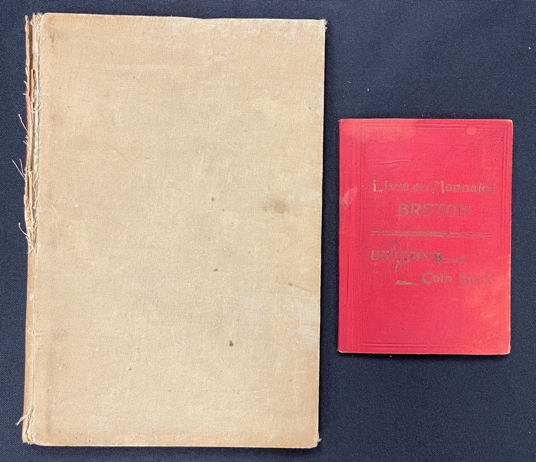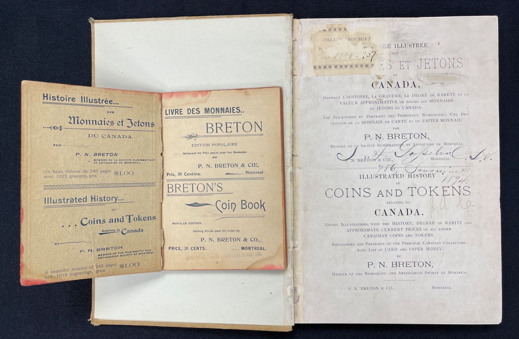 Breton's Coin Book, rare early publication in small format, red cover; Illustrated History of Coins and Tokens Relating to Canada, P.N. Breton, 1894 edition, loose binding, title page stained but inards are mint. 2 Books.