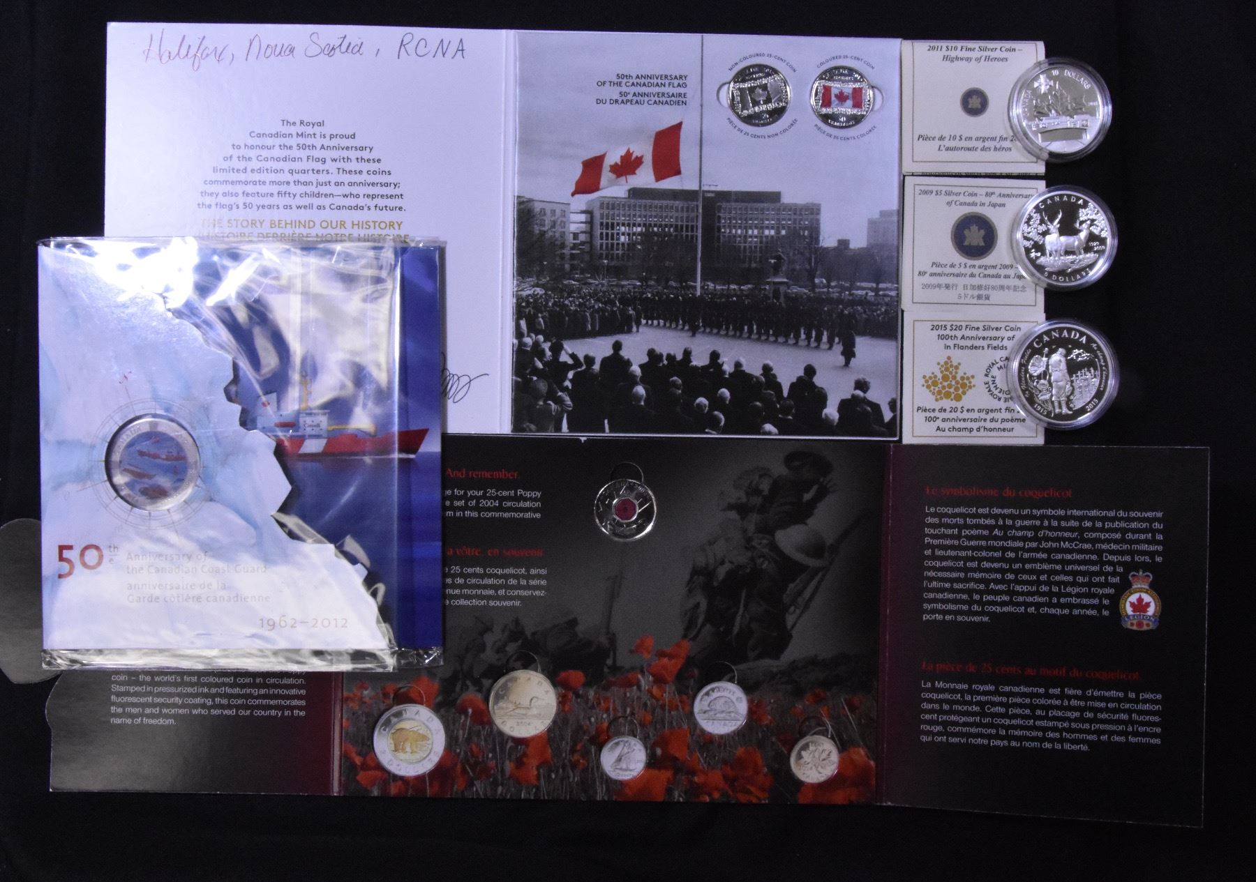 Ten Dollar—Highway of Heroes (mintage 25,000); 1929-2009 Five Dollar Sterling .925 Silver Proof —80th Anniversary of Canada in Japan—(mintage 40,000); 2015 50th Anniversary of the Canadian Flag—2 Twenty-Five Cent Coins (1 colourized) in RCM fold-out board; 1962-2012 Twenty-Five Cent (colourized) - 50th Anniversary of the Canadian Coast Guard in 3-fold-out board; 2004 Twenty-Five Cent (colorized) Lest We Forget the Poppy Coin Collector Card