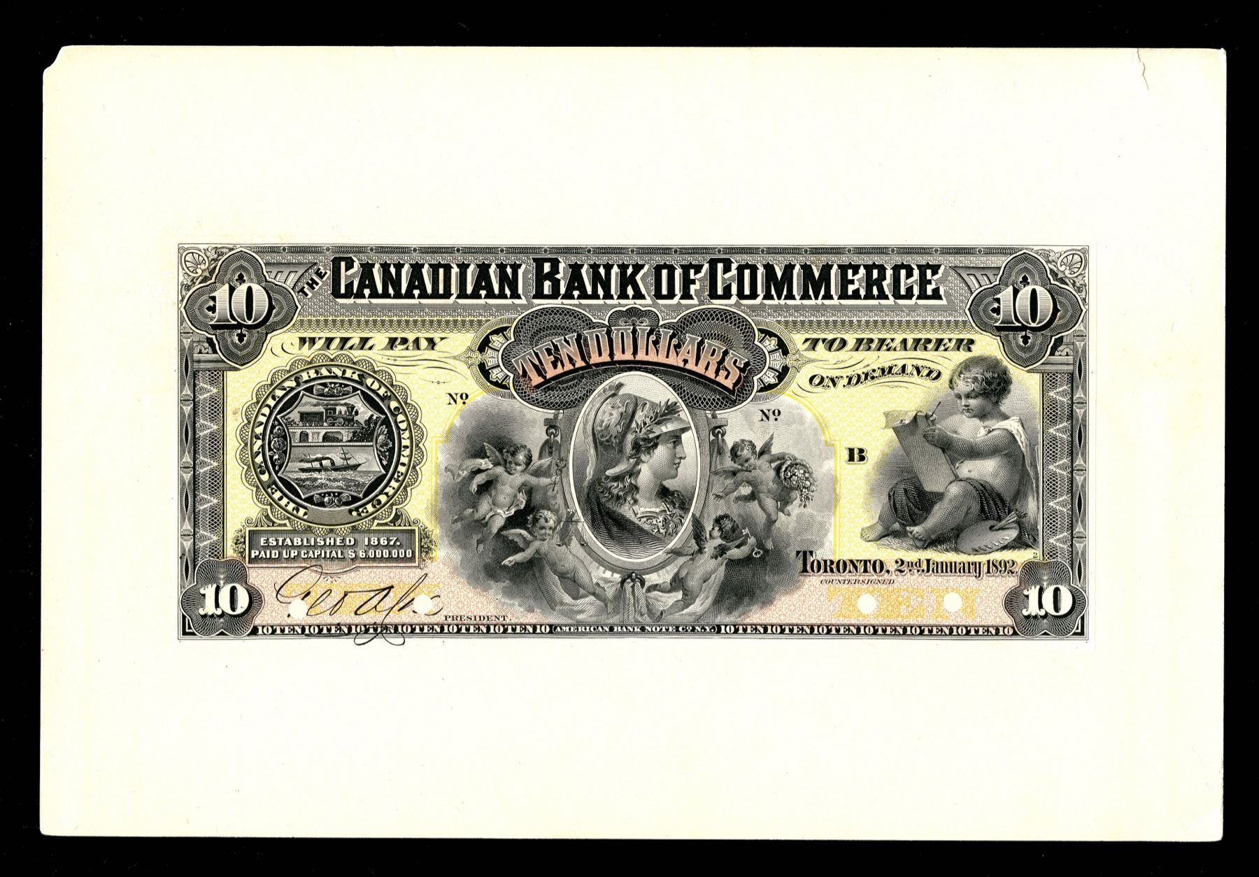 CH 75-14-18P. Punch cancels in signature area as usual. Mounted on card. The card has a small corner tip missing and a minor tear, but these are quite remote from the proof itself.