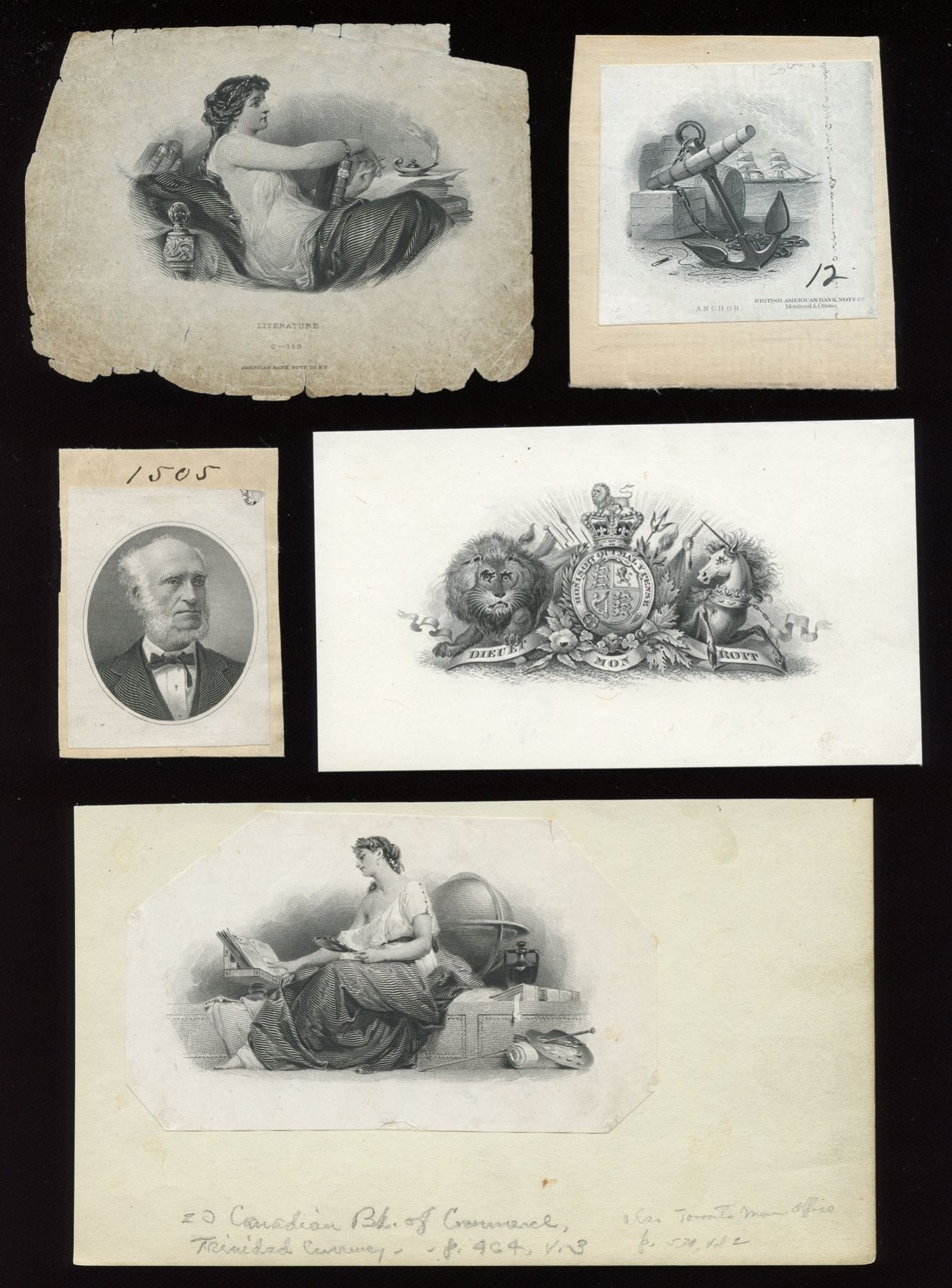 Canadian Bank of Commerce, five die proof vignettes. "La Critique" and "Literature" by ABN, the latter eroded around edges; Royal Crest, Anchor and Wm. McMaster by BABN, the last two have writing and are cut down.