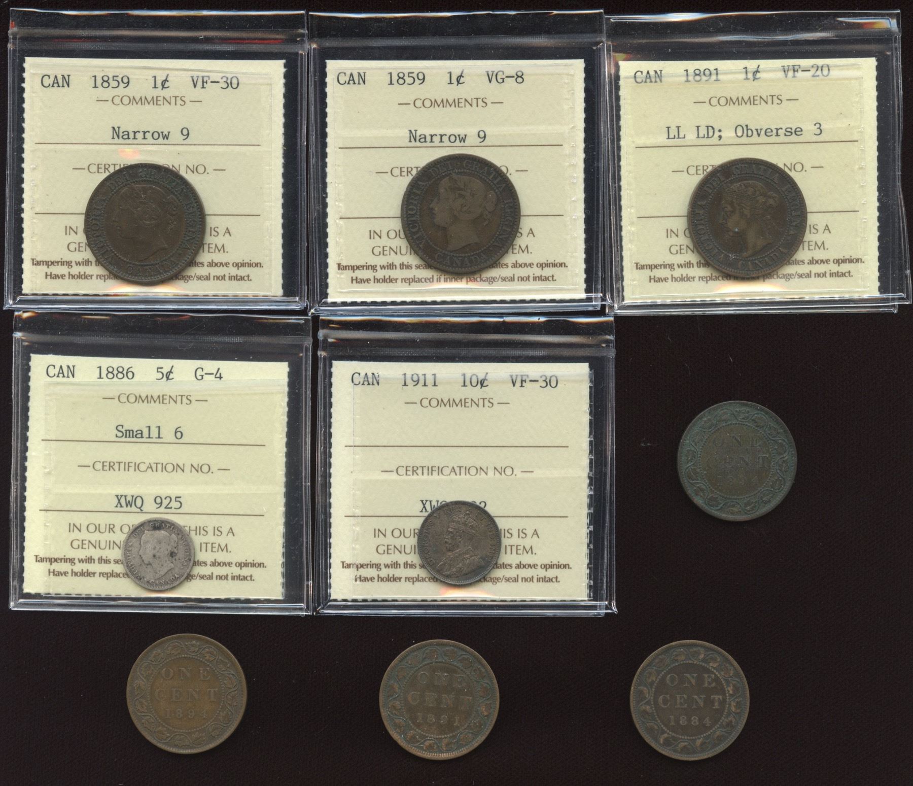 Lot includes One Cent: 2 x 1859, 1884, 2 x 1891, 2 x 1894. Five Cents: 1886. Ten Cents: 1911. 9 Coins.