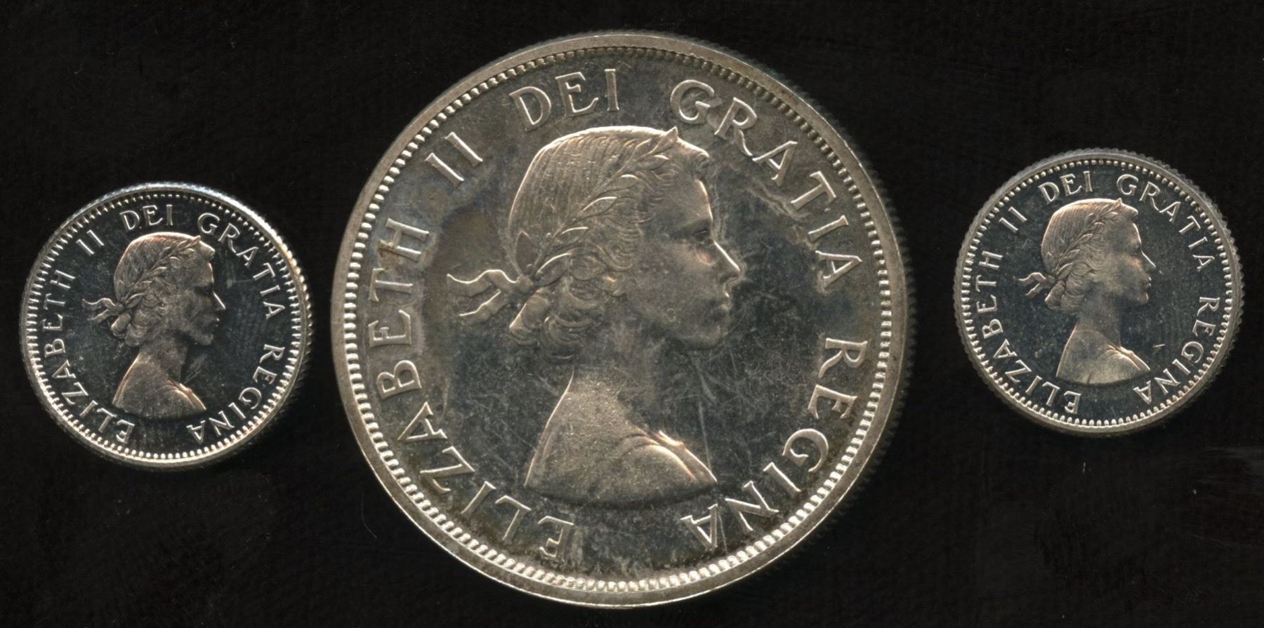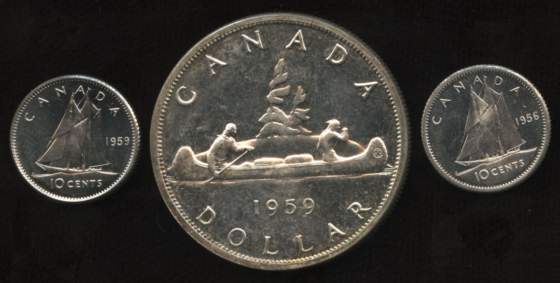 Includes: 1956 & 1959 Ten Cents PL's & 1959 Silver Dollar (AU). 3 Pcs.
