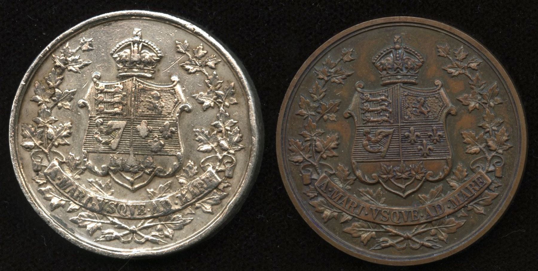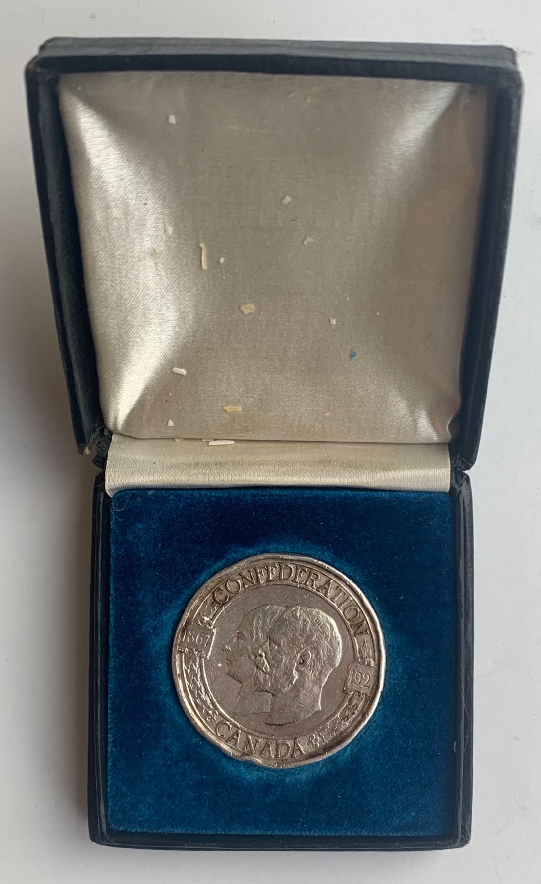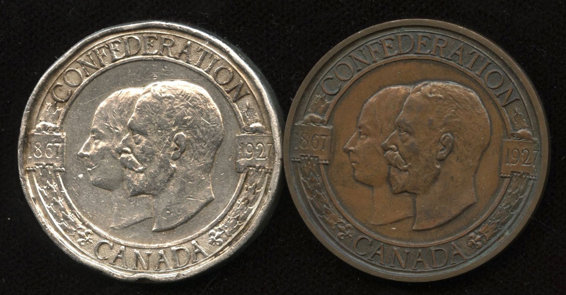1867-1927 Canada Confederation Medals, official issues, silver (sterling, 35mm, edge dings, rare) and copper (35mm), depicting King George and Queen Mary. One in case of issue (damaged)