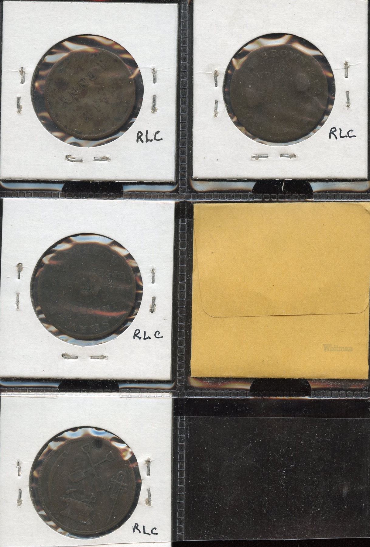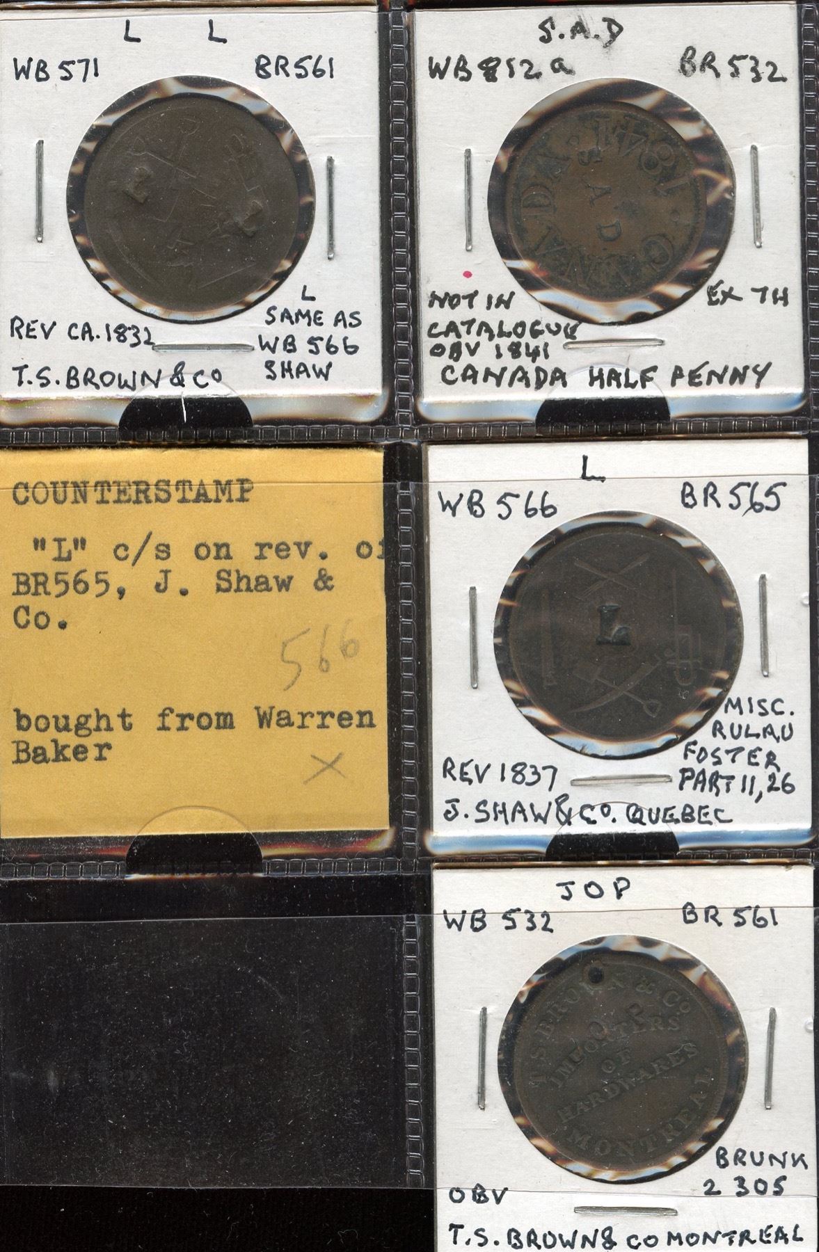 JOP counterpunched on obv. of T.S. Brown’s card, Br 561 (M.I. 532). Piece holed; L on rev. of J. Shaw’s card, Br 565 (M.I. 566); L counterpunched on rev. of T.S. Brown’s card, Br 561 (M.I. 571). This “L” is similar to the previous one; S.A.D. on obv. of James Duncan & Co. ½ penny, 1841, Br 532. 4 Pcs.