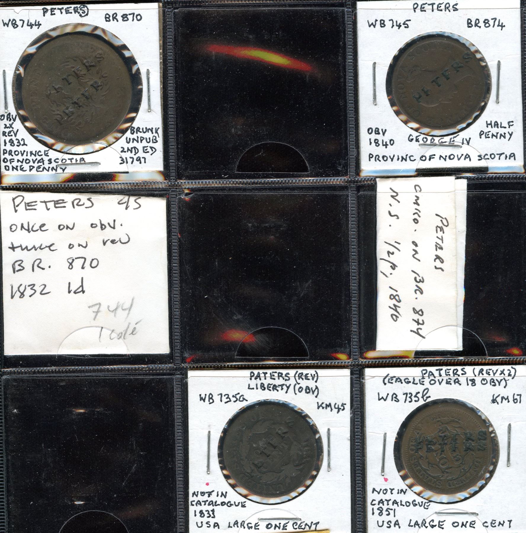 PETER(S) on obv. & PETERS twice on rev. of Nova Scotia penny, 1832, Br 870 (M.I. 744, Brunk P-398); PETERS on obv. of Nova Scotia ½ penny, 1840, Br 874 (M.I. 745); another on rev. of U.S. large cent, 1833 (Brunk U.S.); another on rev. of U.S. large cent, 1851 (Brunk U.S.) 4 Pcs.
