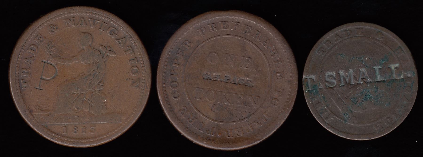 Trade & Navigation countermarks: P on obv. of Trade & Navigation ½ penny, 1813, BR 963; G.H. PAGE. on rev. of Trade & Navigation ½ penny, 1813, BR 963; T. SMALL. on obv. of Trade & Navigation ½ penny, 1813, BR 963 (Brunk S-518). 3 Pcs.