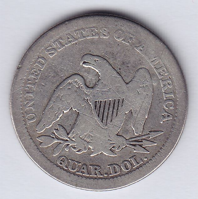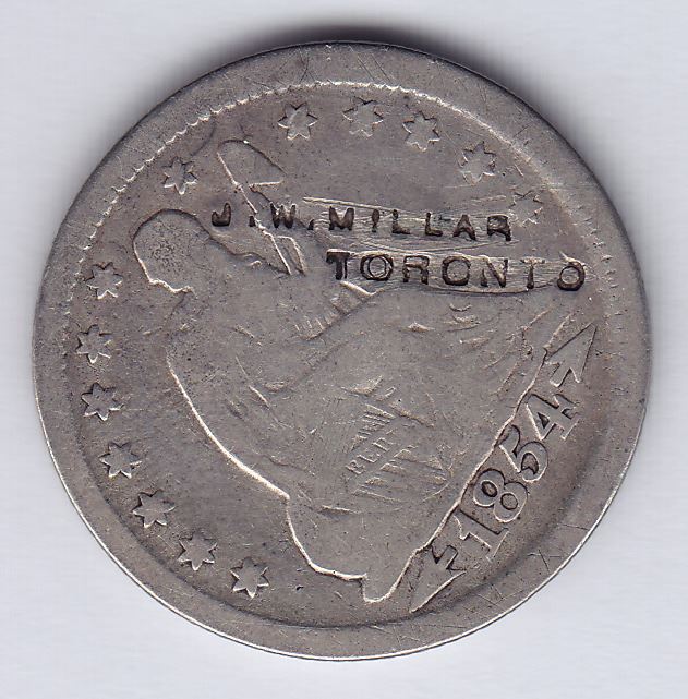 Another J.W. MILLAR countermark on obv. of U.S. quarter dollar, 1854 with arrows (M.I. 653, Brunk M-659).