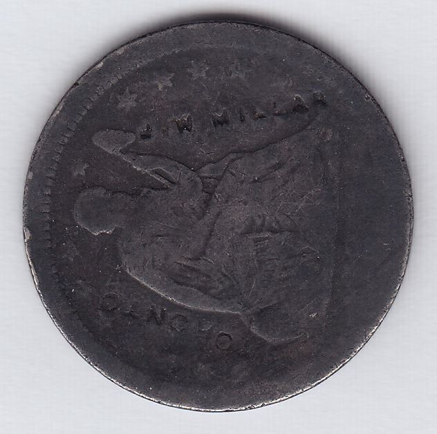 Canadian Countermark - J.W. Millar countermark on obv. of U.S. quarter dollar (Brunk M-659). The two components of the mark – “J.W. Millar” and “Toronto” – are stamped further apart than usually seen.