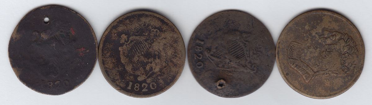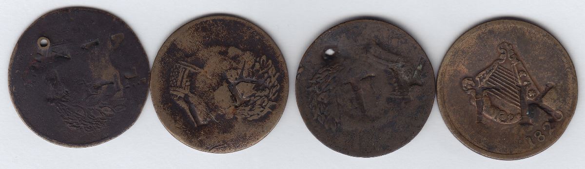 Canadian Countermark - TK countermarks: On obv. of Bust & Harp brass ½ penny, 1820, Br 1012, C. 2, holed. (Brunk K-16); on obv. of Bust & Harp brass ½ penny, 1820, Br 1012, C. 7 (M.I. 888, Brunk K-16); on obv. of Bust & Harp copper(?) ½ penny, 1820, Br 1012, C. 8 (M.I. 889, holed. Brunk K-16); on rev. of Bust & Harp brass ½ penny, 1820, Br 1012, C. 11 (M.I. 890, Brunk K-16). 4 Pcs.
