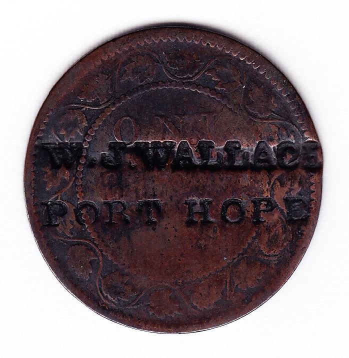 Canadian Countermark - W.J. WALLACE / PORT HOPE on rev. of Province of Canada cent, 1859 (M.I. 984, Brunk W-121).