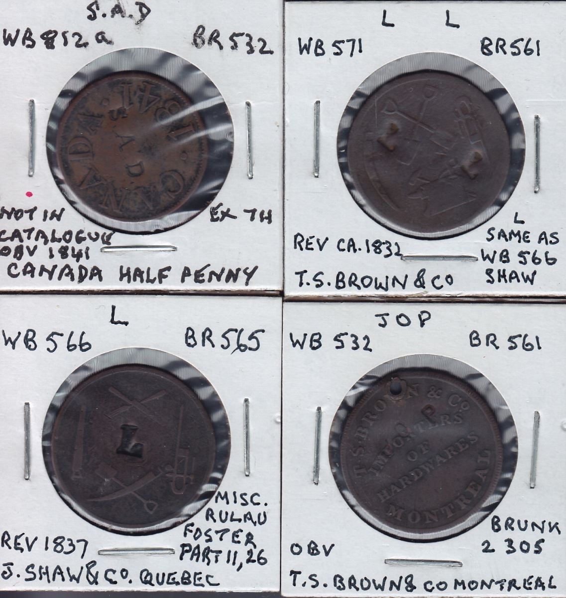 JOP counterpunched on obv. of T.S. Brown’s card, Br 561 (M.I. 532). Piece holed; L on rev. of J. Shaw’s card, Br 565 (M.I. 566); L counterpunched on rev. of T.S. Brown’s card, Br 561 (M.I. 571). This “L” is similar to the previous one; S.A.D. on obv. of James Duncan & Co. ½ penny, 1841, Br 532. 4 Pcs.