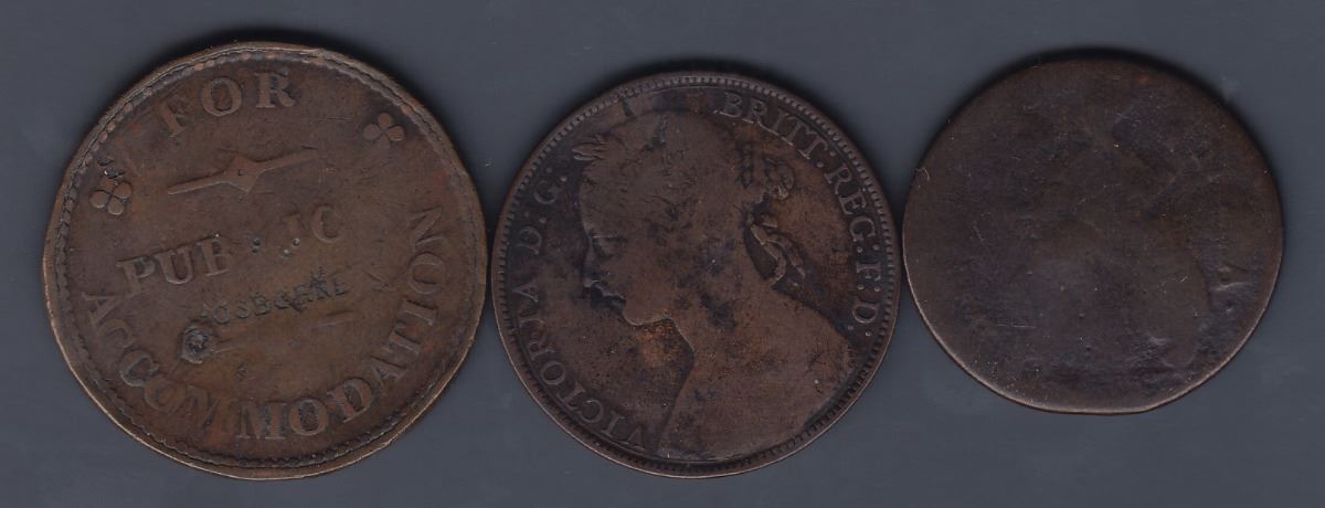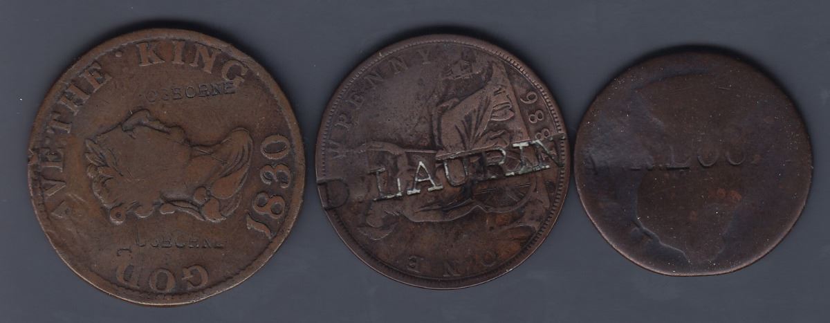 D. LAURIN on rev. of Great Britain penny, 1886 (M.I. 580); W.R. LOO(MIS) on obv. of George III ½ penny (M.I. 597, Brunk L-480 listing W.R. Loomi); OSBORNE twice on obv. and once on rev. of For Public Accommodation penny, 1830 (M.I. 710). This piece more properly belongs under the Isle of Man, and is included only on account of its association with Breton 996 (Marked Impressions). 3 Pcs.