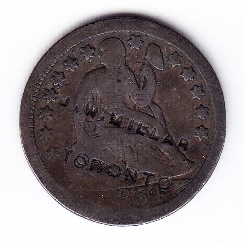 J.W. MILLAR / TORONTO on obv. of U.S. dime, 1854 with arrows (M.I. 652, Brunk M-659).