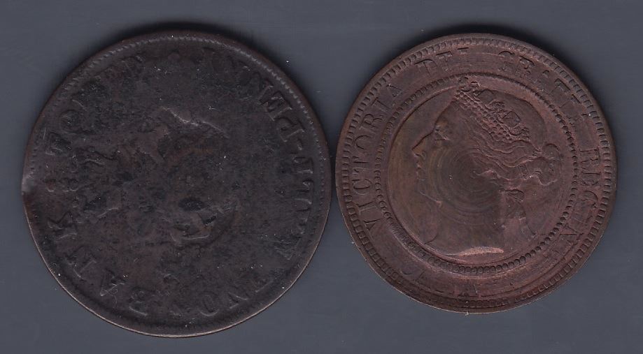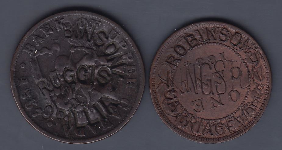 T.H. ROBINSON (curved) / DRUGGIST (curved) / ORILLIA (curved) on obv. of Bank of Upper Canada ½ penny, 1857, Br 720 (Brunk R-411); ROBINSON’S CARRIAGE WORKS (in circle) and KINGSTON (in center) on rev. of Canada Victoria cent, 1884 (M.I. 785, Brunk R-411). 2 Pcs. See Marked Impressions for a history of this countermark.