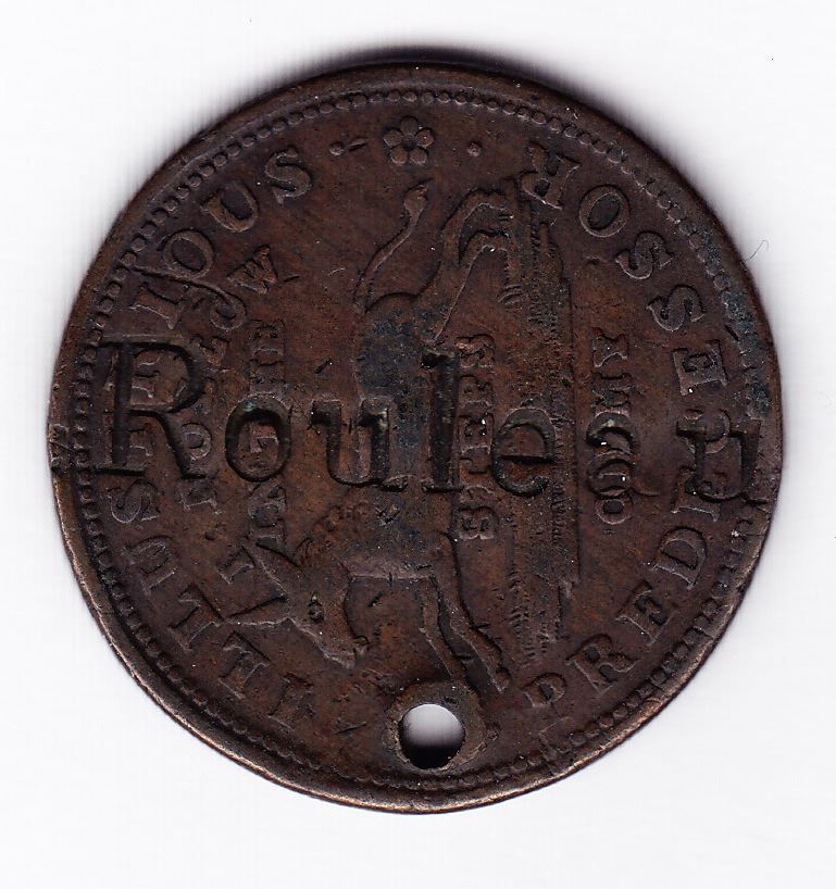 Rouleau countermark on rev. of U.S. Hard Times token, 1837, Low 18 (M.I. 797, Brunk R-551). Piece holed.