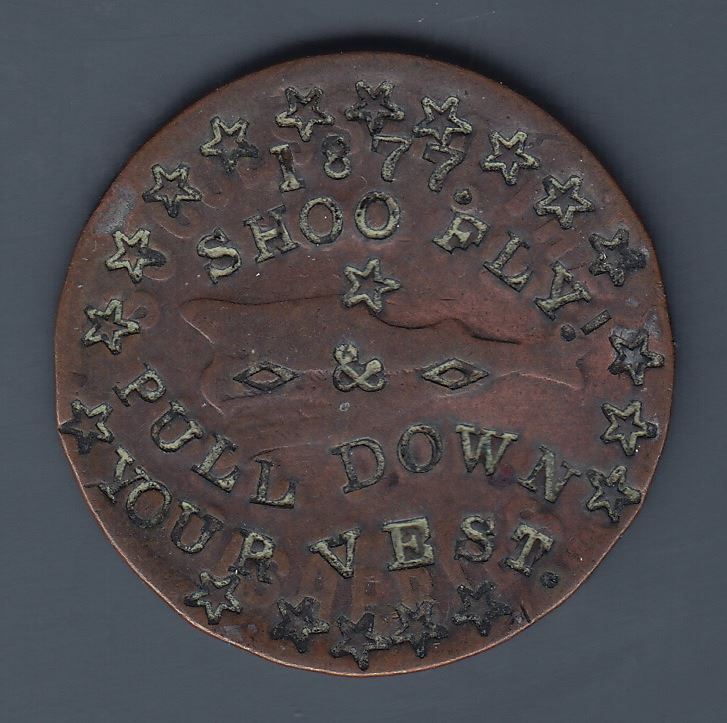 1877. / SHOO FLY! / ? / & / PULL DOWN / YOUR VEST. all enclosed by stars on obv. of Success to the Fisheries penny, Br 917 (Brunk S-414).