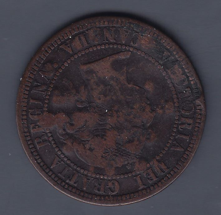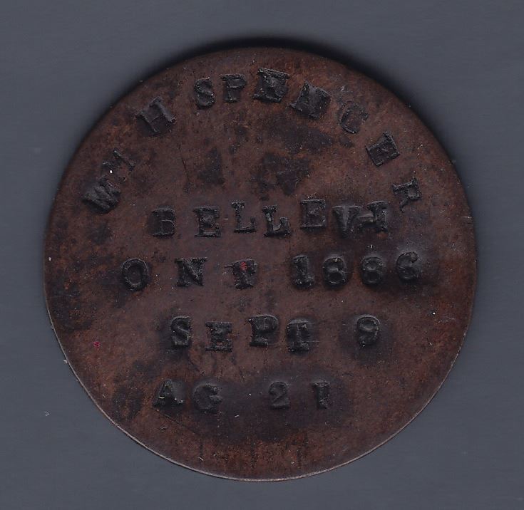 WM H SPENCER (curved) / BELLEV-L / ONT 1886 / SEPT 9 / AG(E) 21 counterpunched on rev. of Canada Victoria cent (M.I. 852, Brunk S-764).