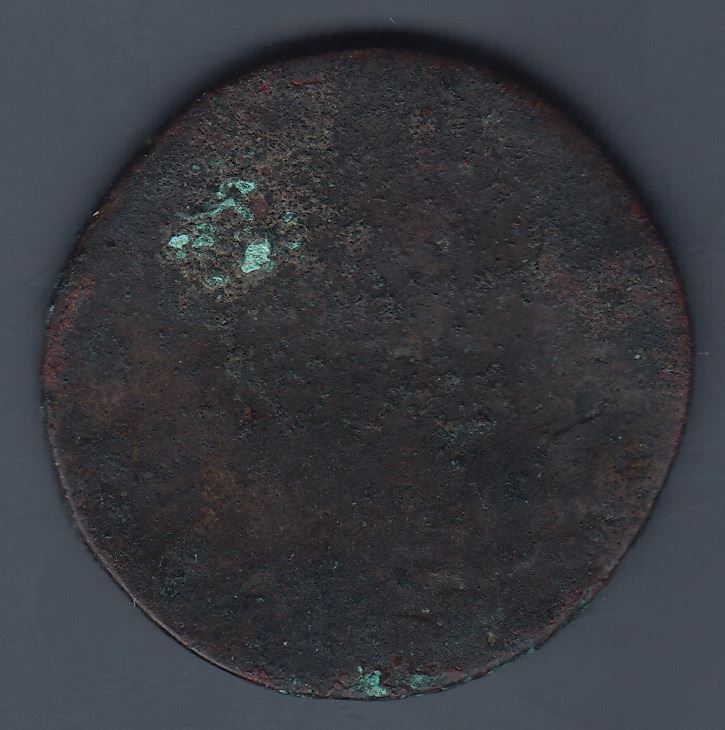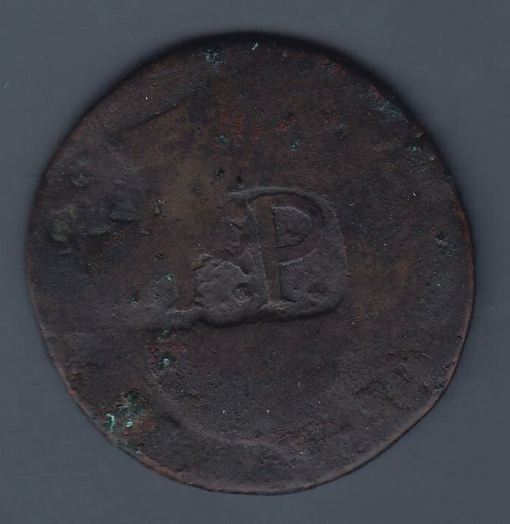 ST. P. within cartouche on obv. of George II counterfeit ½ penny (M.I. 818).