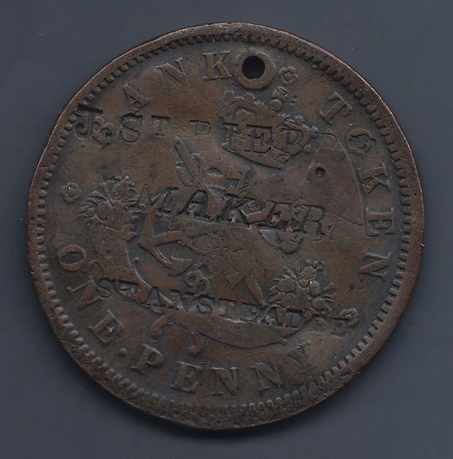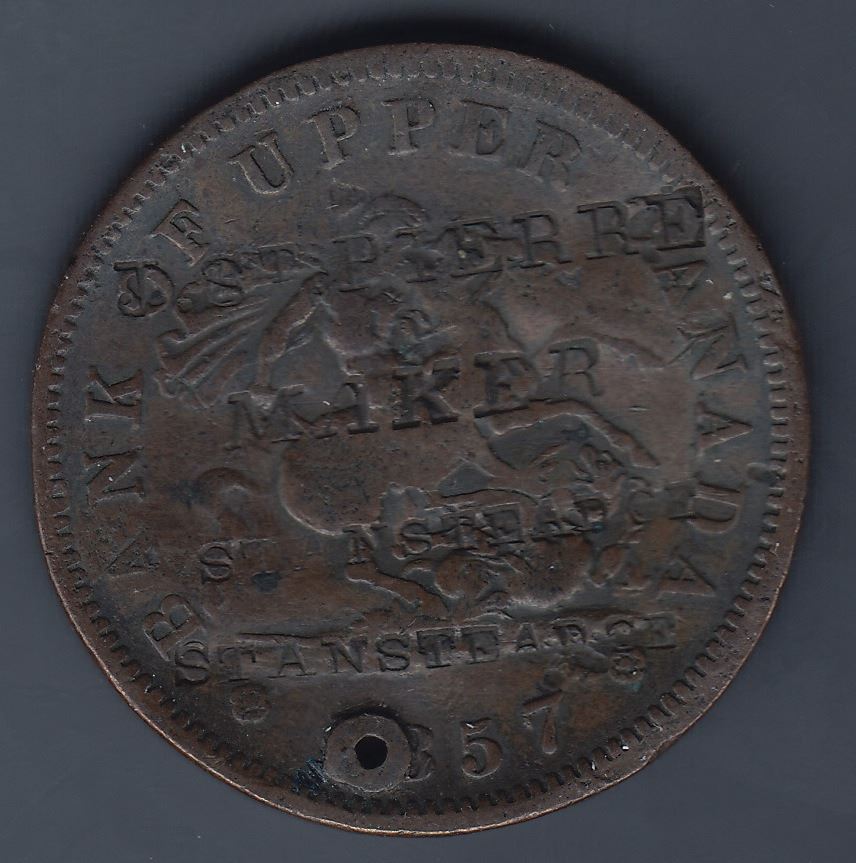 J. ST. PIERRE / MAKER (slanted) / STANSTEAD CE (twice) on obv. & rev. of Bank of Upper Canada penny, 1857, Br 719 (M.I. 819). Piece holed.