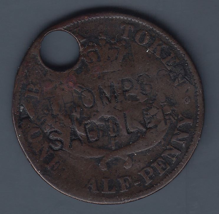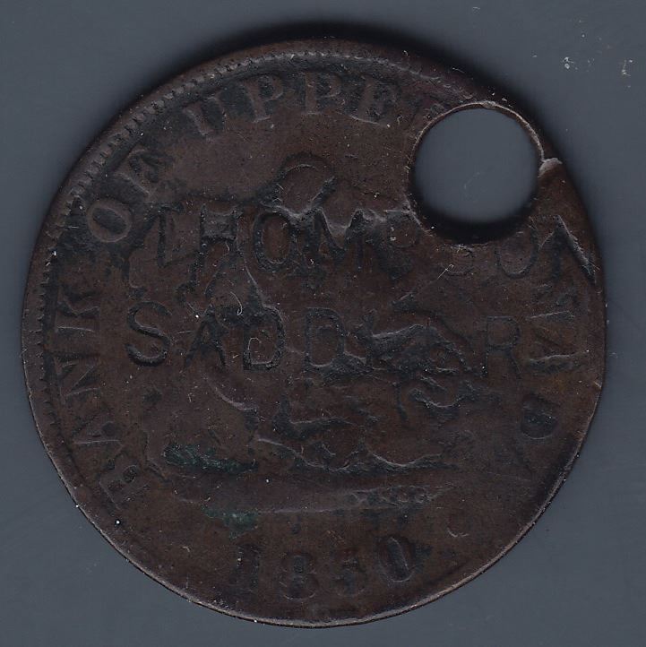 A. THOMPSON / SADDLER on obv. & rev. of Bank of Upper Canada ½ penny, 1850, Br 720. Piece holed.