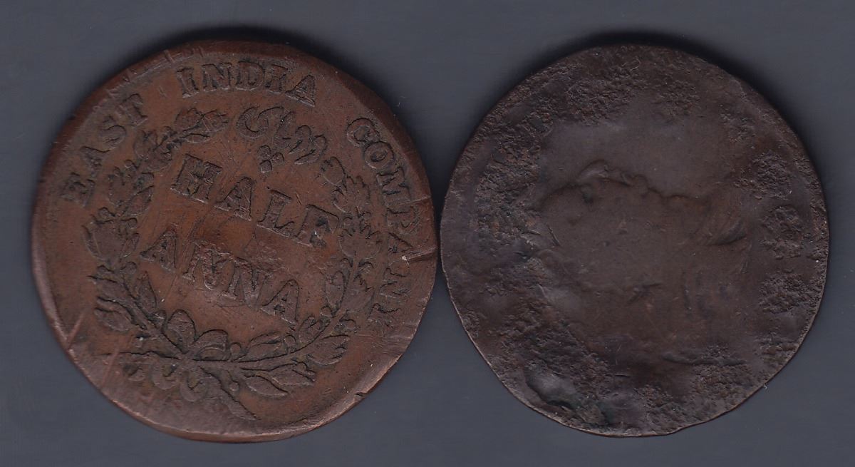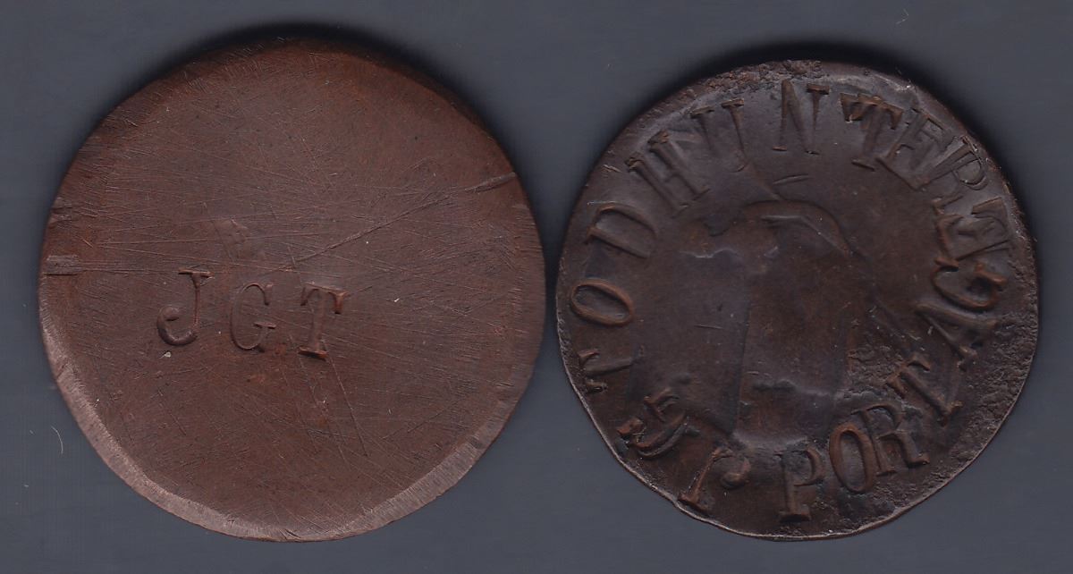 JG TODHUNTER PORTAGE (in circle) counterpunched on rev. of British George III ½ penny, 1806 (Brunk T-337); JGT counterpunched on planed obv. of East India Company half anna. 2 Pcs.