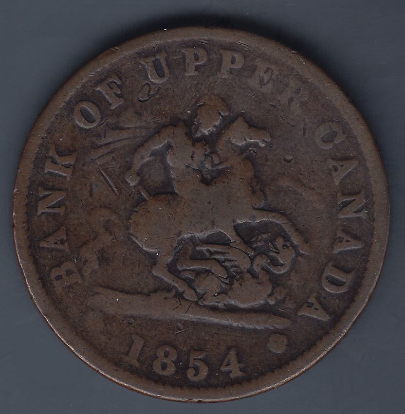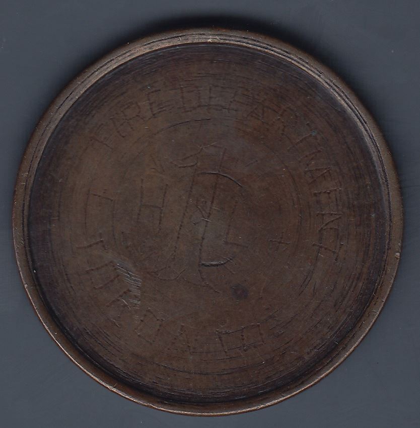 TORONTO FIRE DEPARTMENT (in circle) / H(ook), an ampersand within the number 1 and L(adder), all very weakly engraved on planed or worn rev. of Bank of Upper Canada ½ penny, 1854, Br 720 (M.I. 920).