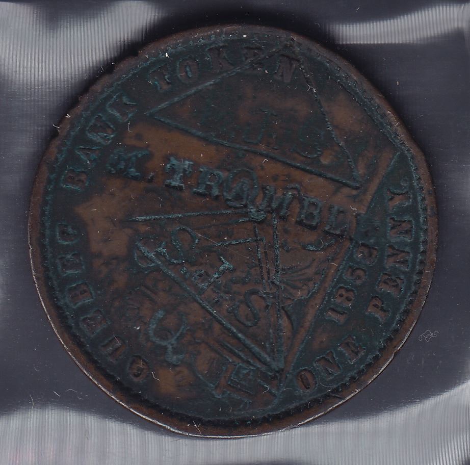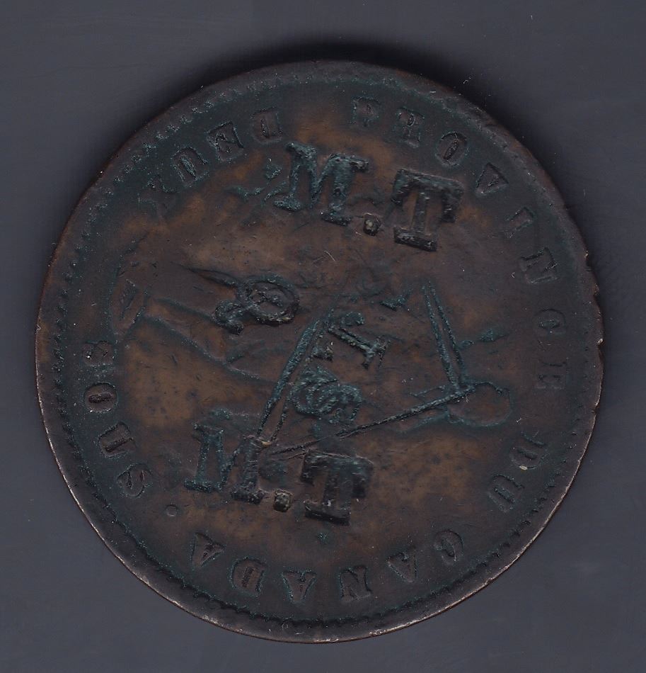 Two masonic(?) triangles containing the initials S.J.S, one above and one below M. TRAMBLE, also the letter Q, on rev. and a Masonic triangle (?) with S.J.S initials, M.T countermarked twice and a Q on obv. of Quebec Bank penny, 1852, Br 528 (Brunk T-393 lists two M. Tramble countermarks on Canadian tokens).