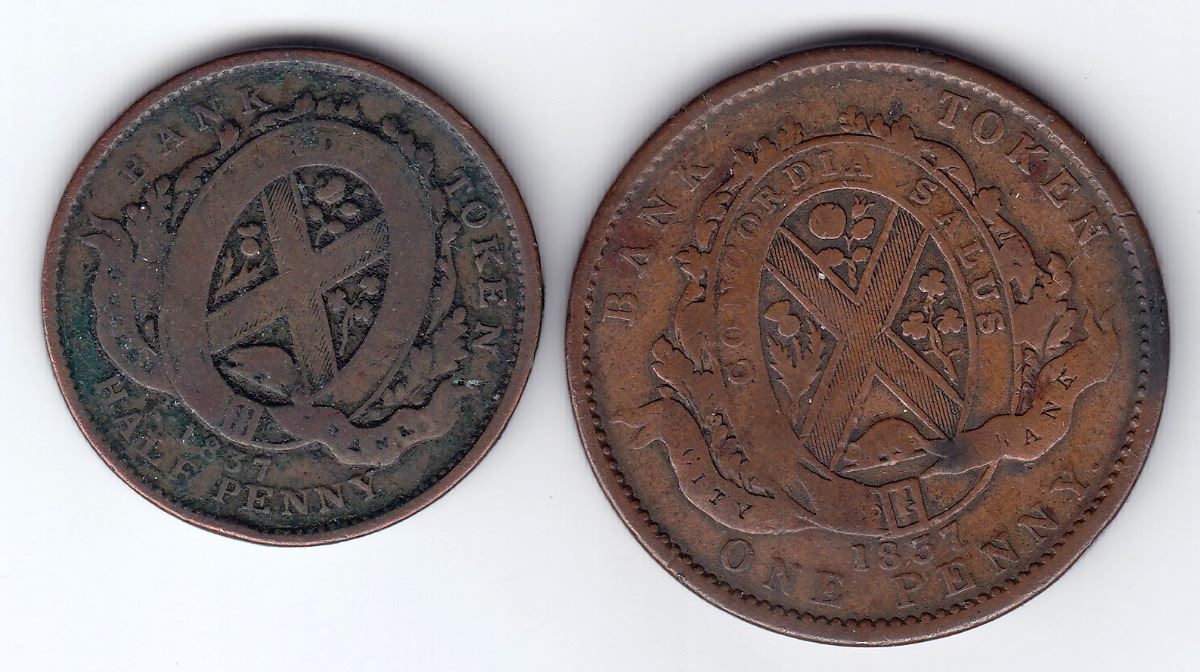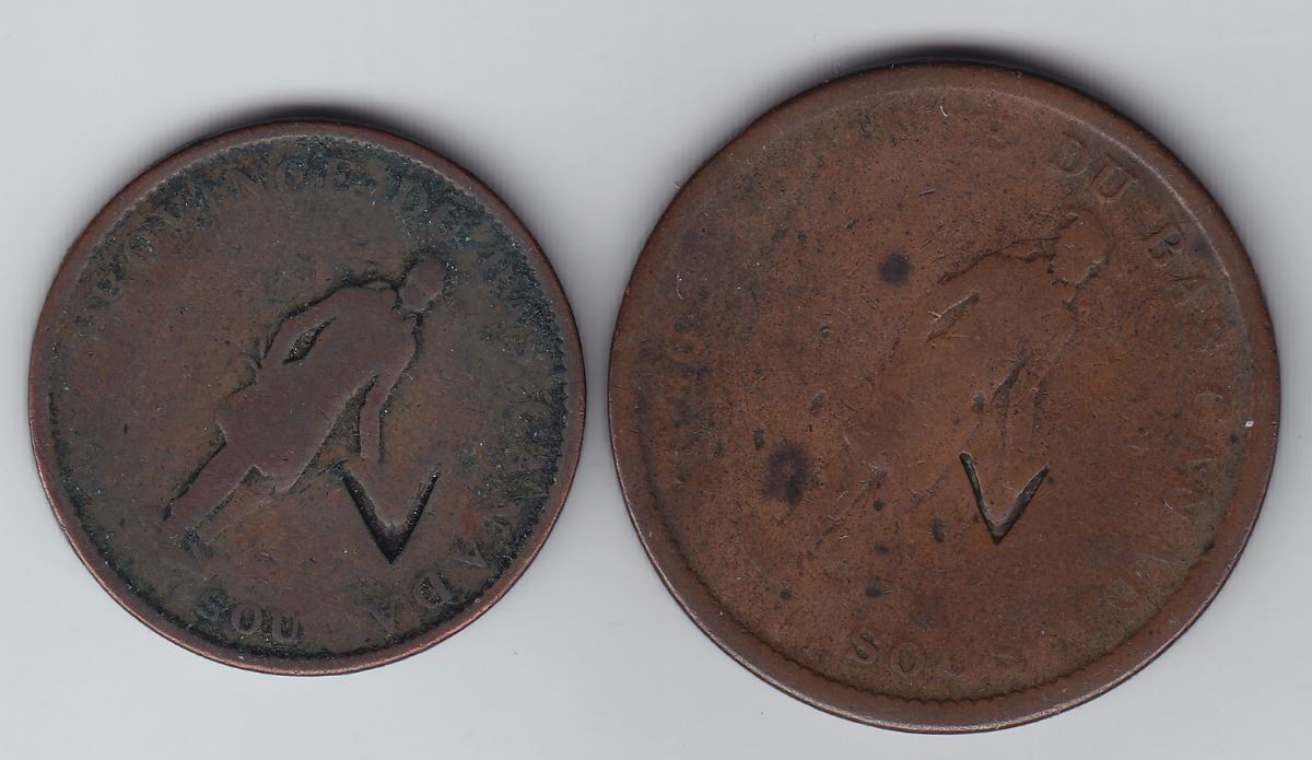 V countermarks: On obv. of Quebec Bank ½ penny, 1837, Br 522; on obv. of City Bank penny, 1837, Br 521. 2 Pcs.