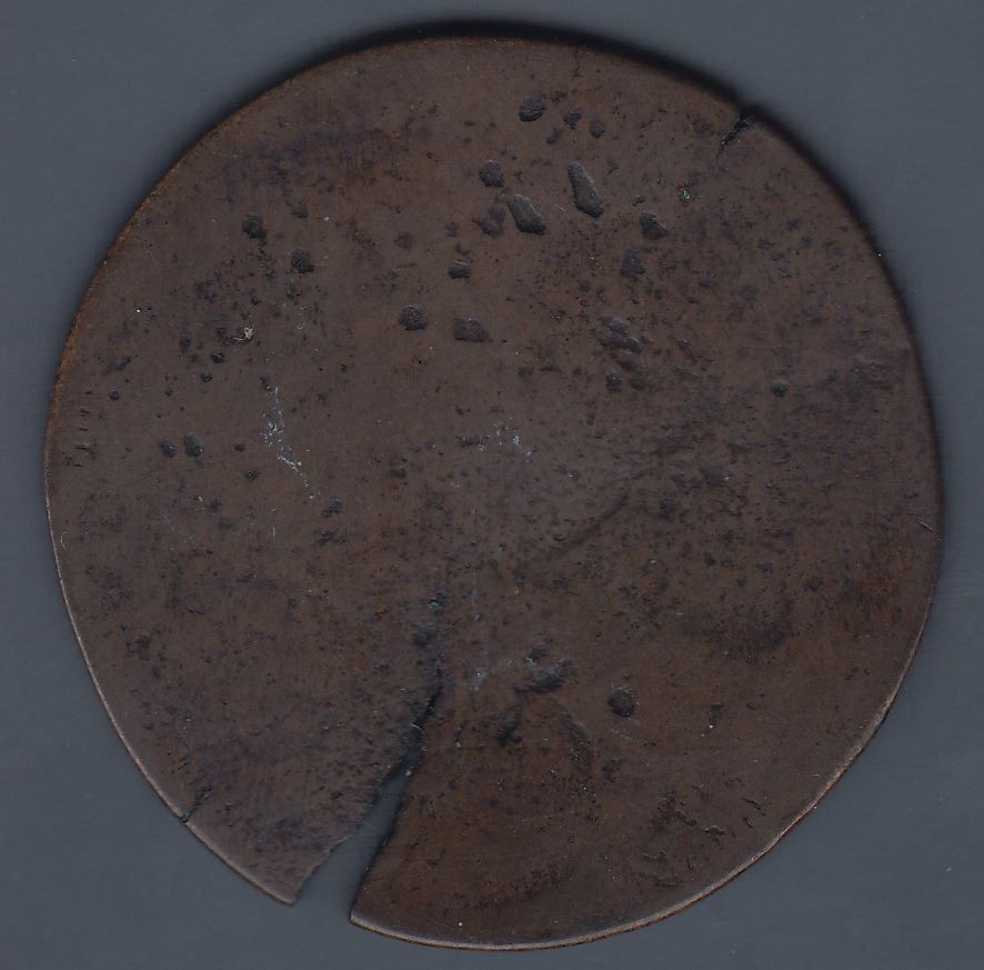 J.M. WILLIAMS & Co. / HAMILTON ONT. on what appears to be a Great Britain penny. The mark is well worn and on a cracked flan. It’s difficult to determine whether it is countermarked or engraved. (M.I. 1008).
