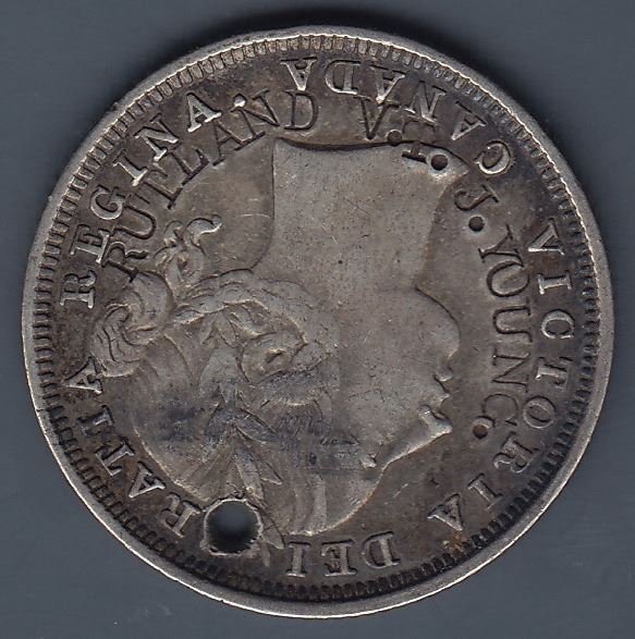 RUTLAND V.T. J. YOUNG (in semicircle) counterpunched on obv. of Province of Canada 20¢, 1858. Piece holed.