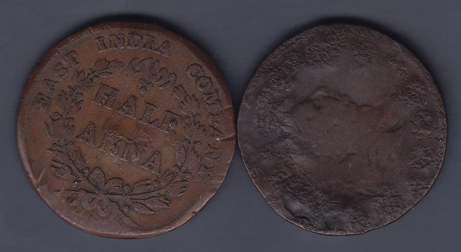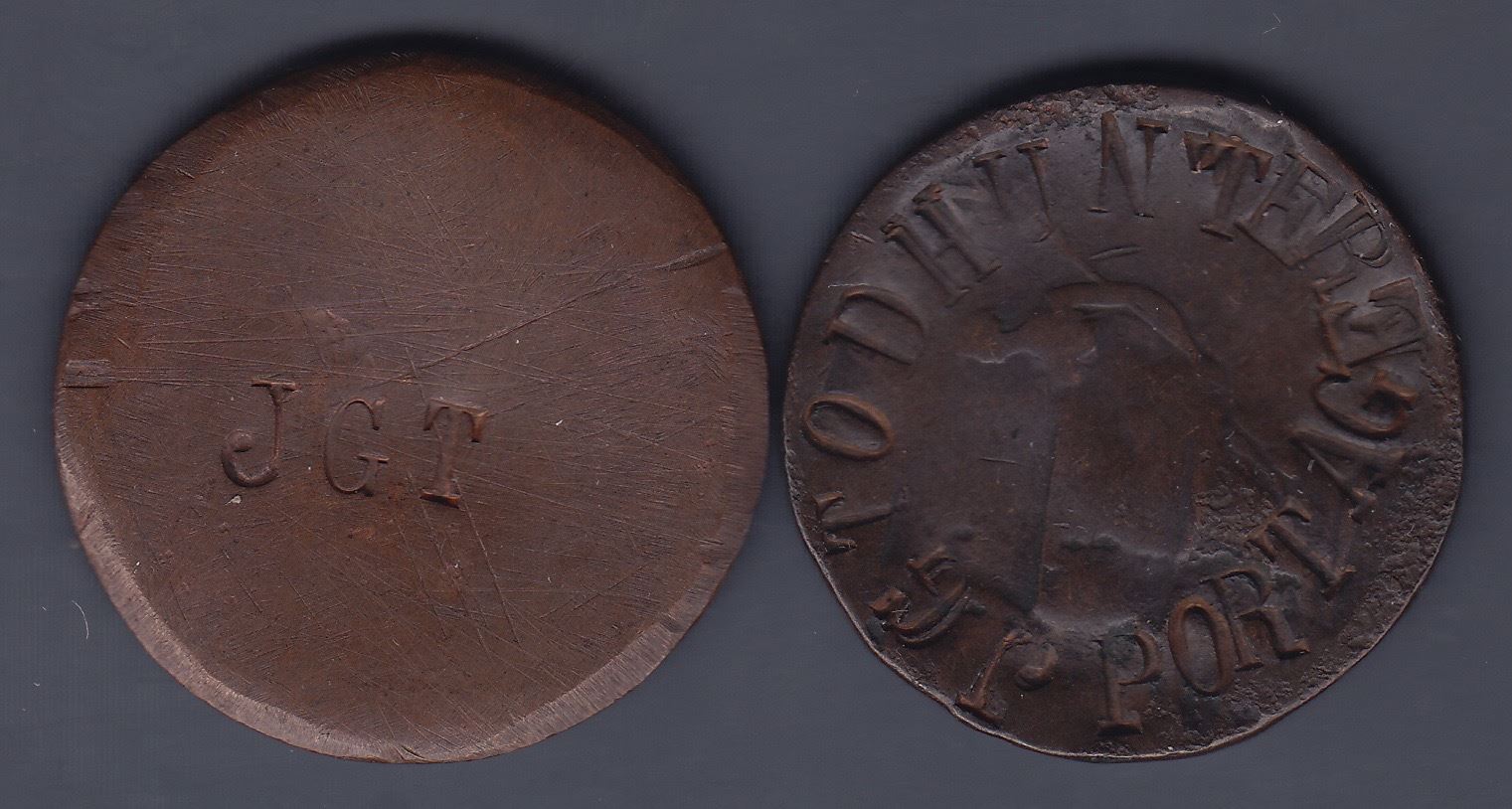 JG TODHUNTER PORTAGE (in circle) counterpunched on rev. of British George III ½ penny, 1806 (Brunk T-337); JGT counterpunched on planed obv. of East India Company half anna. 2 Pcs.
