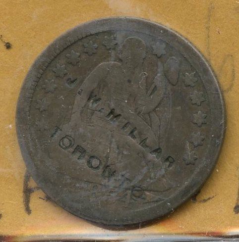 J.W. MILLAR / TORONTO on obv. of U.S. dime, 1854 with arrows (M.I. 652, Brunk M-659).