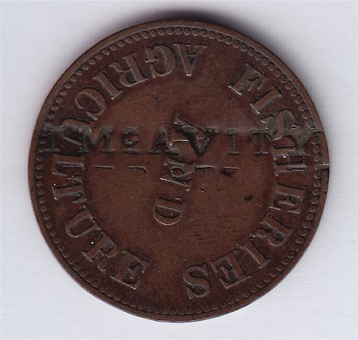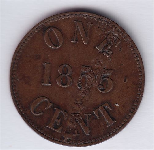 As last. - The letters on the second line are even weaker than the preceding, only the tops of TER STR are visible to even a lesser degree than the last. The counterstamp is over the obverse of Br. 920, 1855 P.E.I. cent. (Brunk M-341, Canada section)