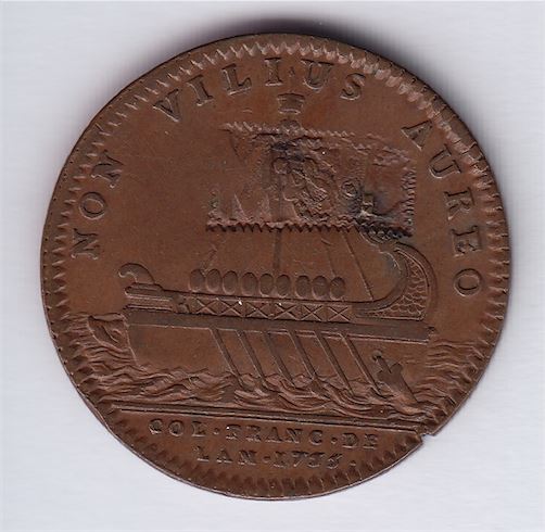 M.S.L. - in large letters, within a crenelated cartouche on the rev. of Br. 515, the Franco-American jeton, depicting the Argonauts galley suspending a beaver skin, above which, NON VILIUS AUREO, referencing the beaver or fur trade, which was not inferior to gold. (M.I. 610) Ex-Ringo.